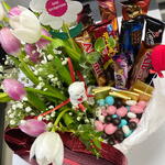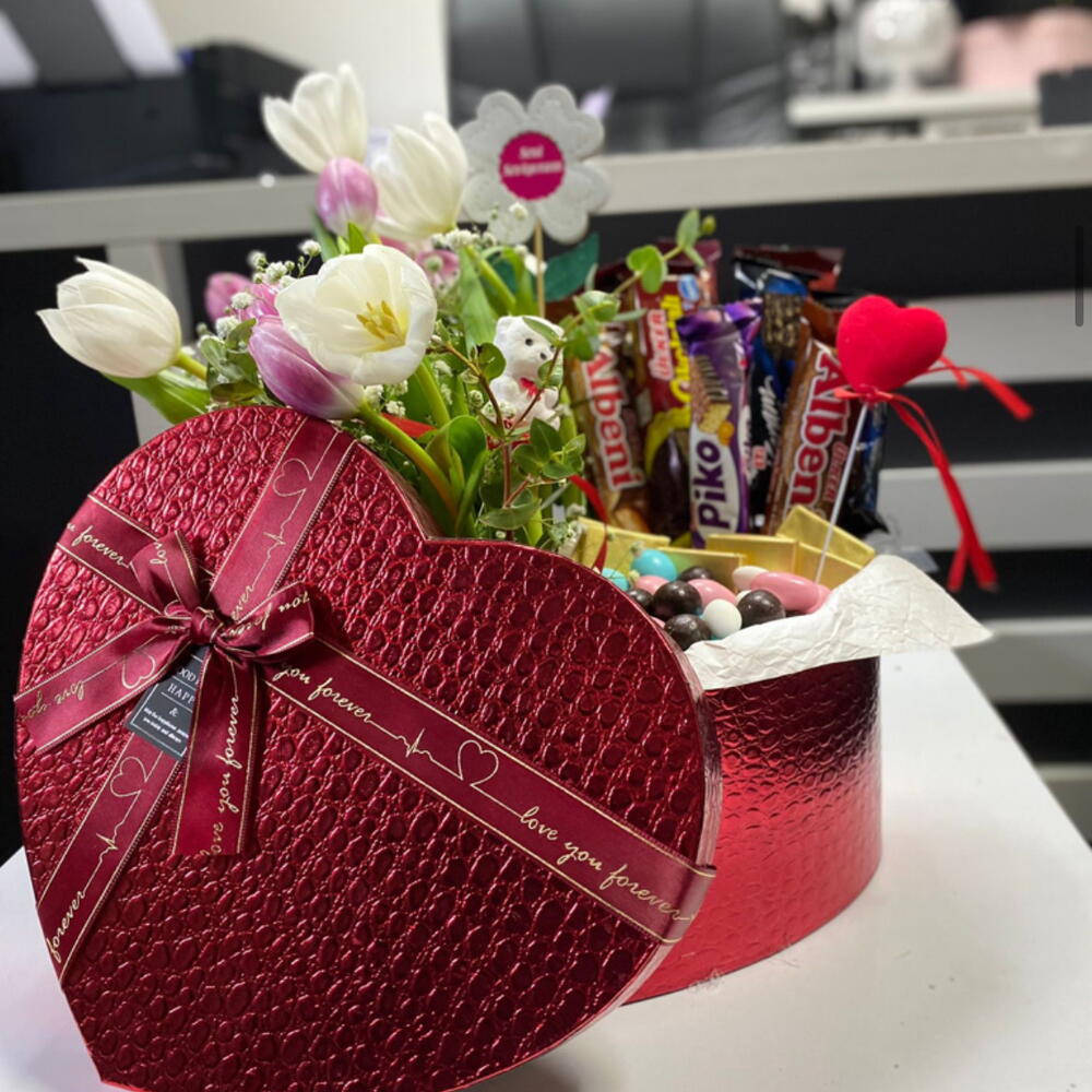 Kırmızı Kalp Kutuda Draje Çikolata ve Laleler
