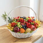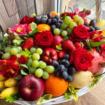 The luxury seasonal fruit basket is a stunning gift option prepared with ultra-fresh fruits and elegant red roses. Ideal for birthdays, get-well wishes, new job congratulations, or special occasion celebrations, this premium fruit arrangement offers a healthy, stylish, and delicious surprise. Tropical and seasonal fruits presented in a handmade wicker basket combine with decorative floral details to create a gift that is both visually appealing and nutritious. A fruit basket gift is a perfect choice for those seeking healthy gift options and a luxurious fruit arrangement.