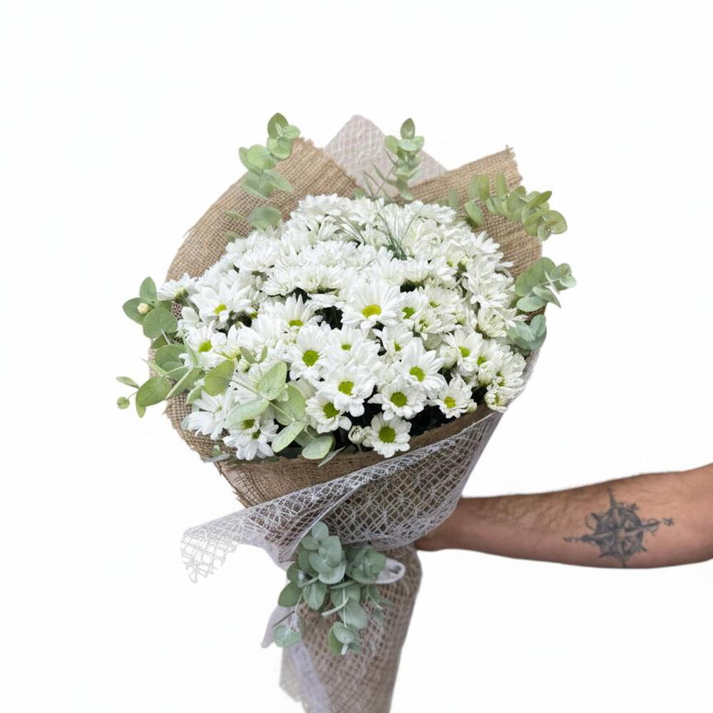 Doğallığı ve sadeliği bir araya getiren bu beyaz papatya buketi, şık abaka ambalajı ile rustik ve modern bir görünüm sunar. Taptaze beyaz papatyalar, okaliptus yapraklarıyla zenginleştirilerek doğal dokulu abaka ambalajla özenle hazırlanmıştır. Huzur veren görünümü sayesinde doğum günü, teşekkür, geçmiş olsun ya da içten bir sürpriz için ideal bir tercihtir. Abaka ambalaj, bukete hem doğal hem de premium bir hava katar.
