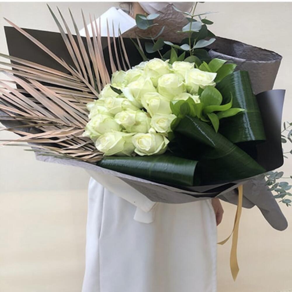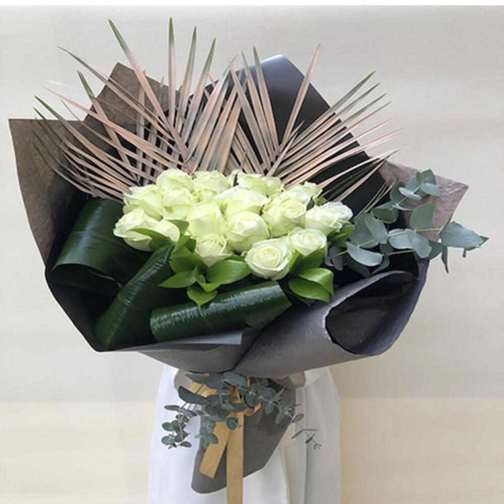 This unique flower bouquet has been carefully prepared with 21 white roses, 10 fenix that provide a different touch, eucalyptus leaves and 3 asprisya leaves to offer a luxurious and elegant look. This wonderful bouquet, which will make your special days more dazzling, will be the most beautiful way to show your loved ones how much you value them. Each flower has been carefully selected by our florists, and the bouquet is designed to be presented in the best possible way while preserving its freshness and natural beauty.