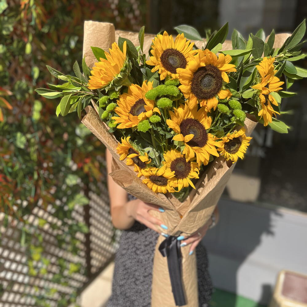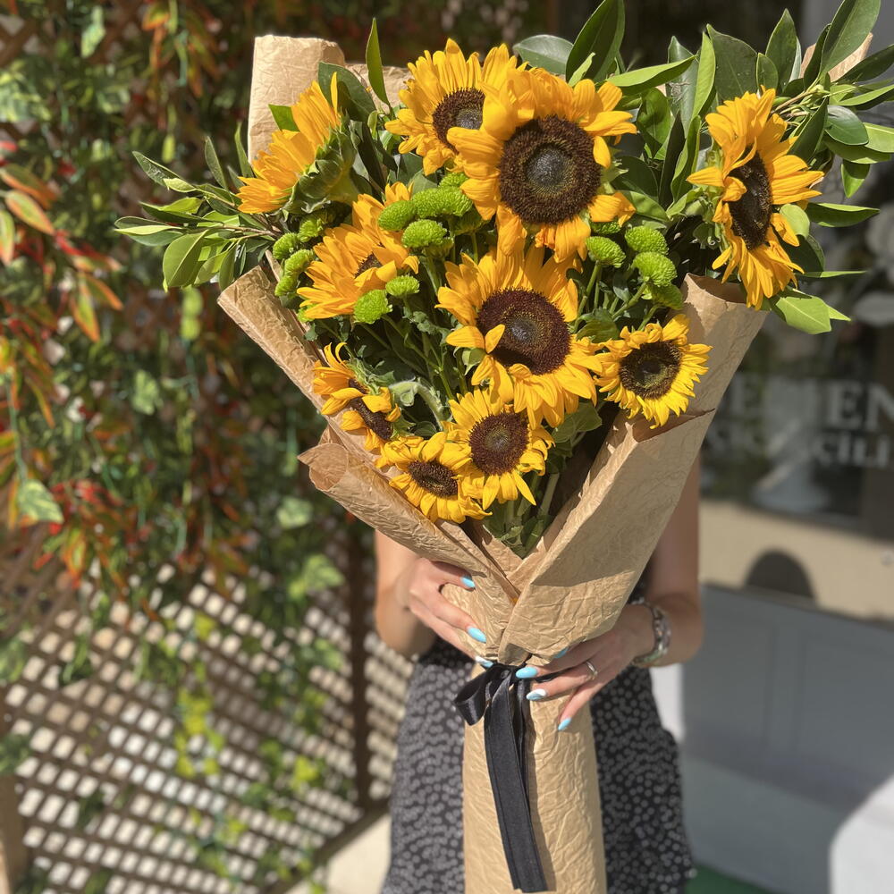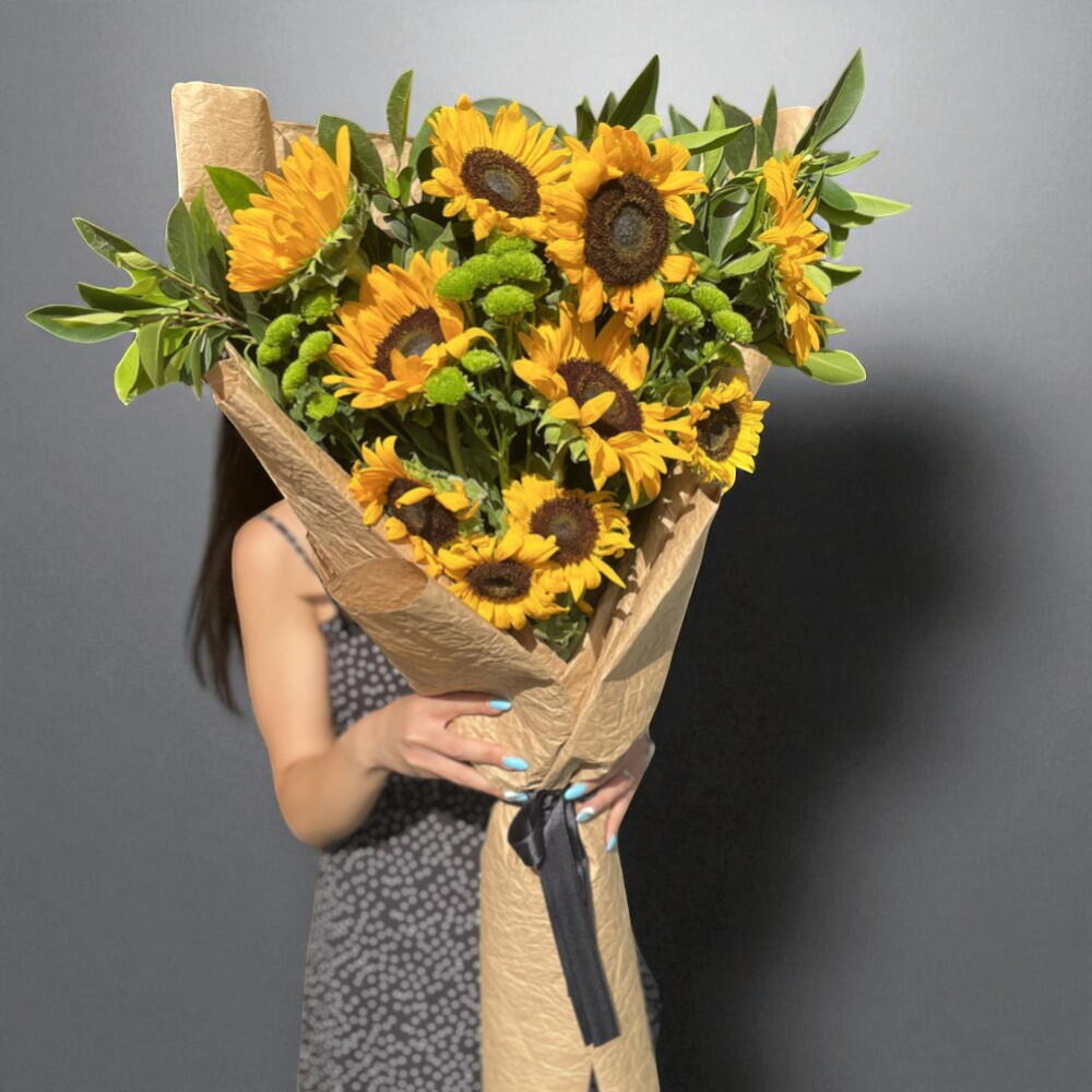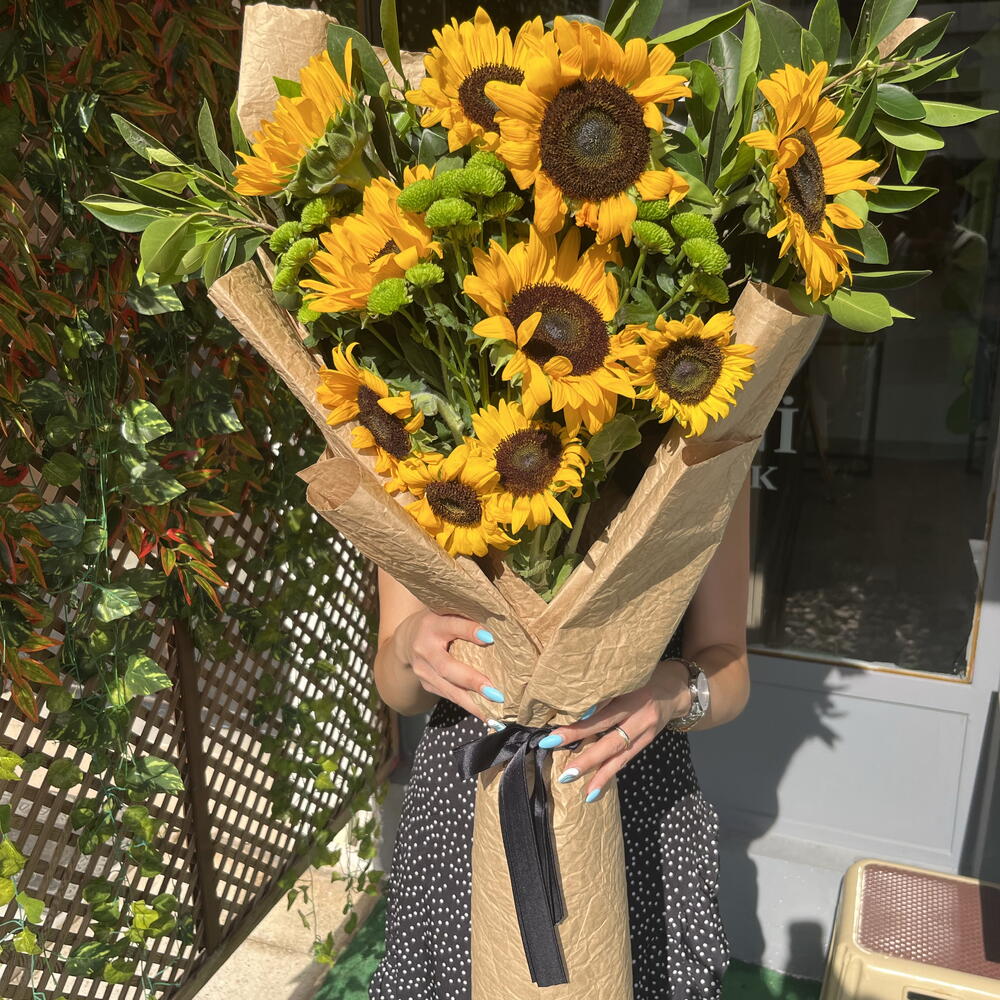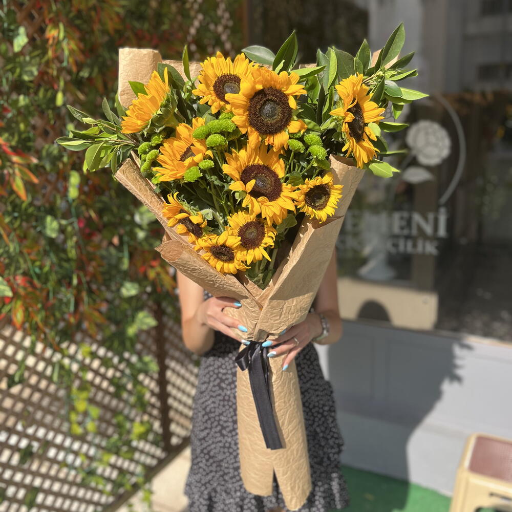 This special mixed bouquet is designed with 10 sunflowers known for their lively and energetic aura, 6 greens believed to add freshness and naturalness, and 15 green chrysanthemums symbolizing abundance. This unique and carefully prepared bouquet is a perfect gift option that will make your loved ones feel how special they are. Each flower reflects the beauty of nature, and when brought together, they create a perfect harmony. This mixed bouquet will add light and positive energy to your loved ones.