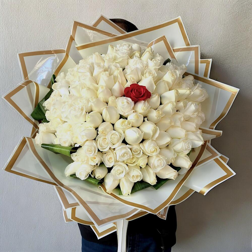 A unique bouquet where endless love, purity, and elegance come together! This magnificent bouquet, crafted with the nobility of pure white roses, is completed with a single red rose—the most special symbol of love. It is a perfect gift choice for special occasions, anniversaries, and unforgettable moments.