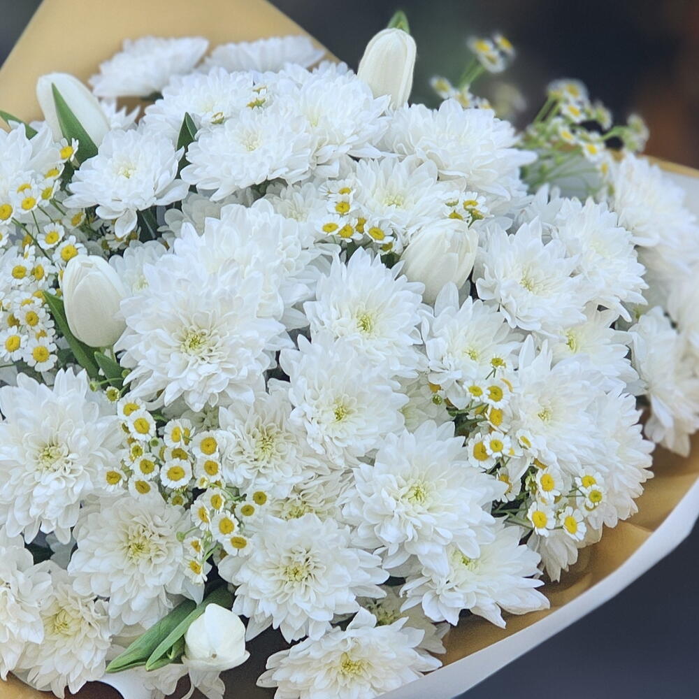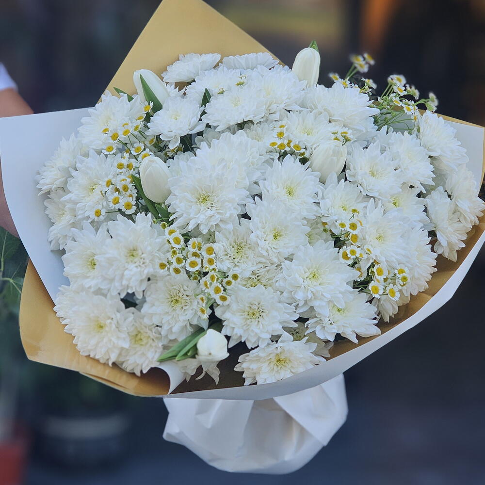 This stunning flower bouquet will perfectly express your feelings. This special arrangement is designed with enchanting 9 white reds, 7 delicate white tulips, and charming 5 mini daisies. This flower bouquet offers a unique combination of natural beauty and elegance. Share your most special moments with this magnificent flower bouquet and create a big smile on the faces of your loved ones.