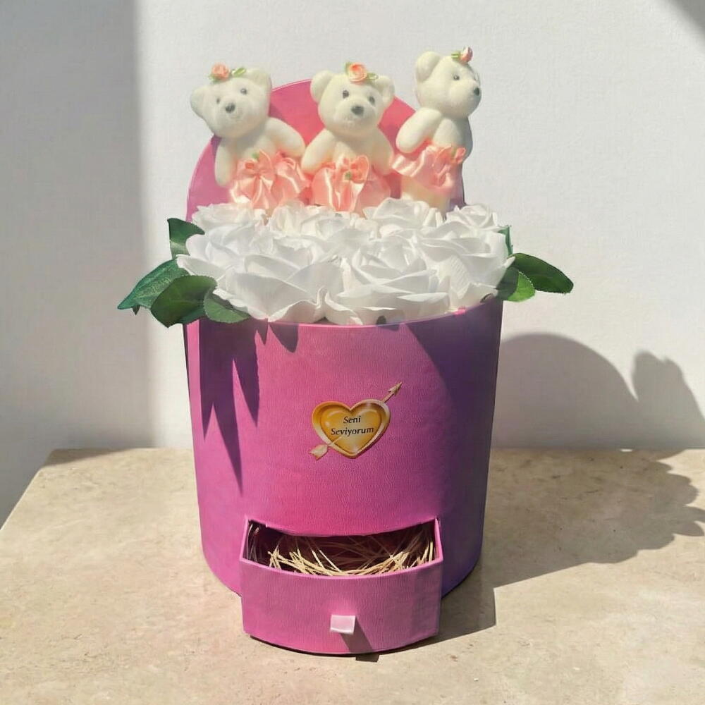White Rose and Teddy Bear Gift Box is a perfect gift option that combines elegance and innocence. This stylish box is filled with 12 fresh white roses. The roses, each carefully selected and arranged, enhance the box's natural charm, offering an unforgettable gift. The cute teddy bears included in the box make this special gift even more meaningful and sweet. Care Recommendations: Artificial roses are extremely easy to care for. To regularly remove dust from the bouquet, simply wipe it with a soft cloth. By keeping your bouquet away from direct sunlight, you can prevent the colors from fading. Artificial flowers retain their beauty for a long time, so you don't need to perform frequent maintenance.
