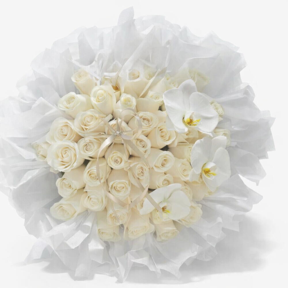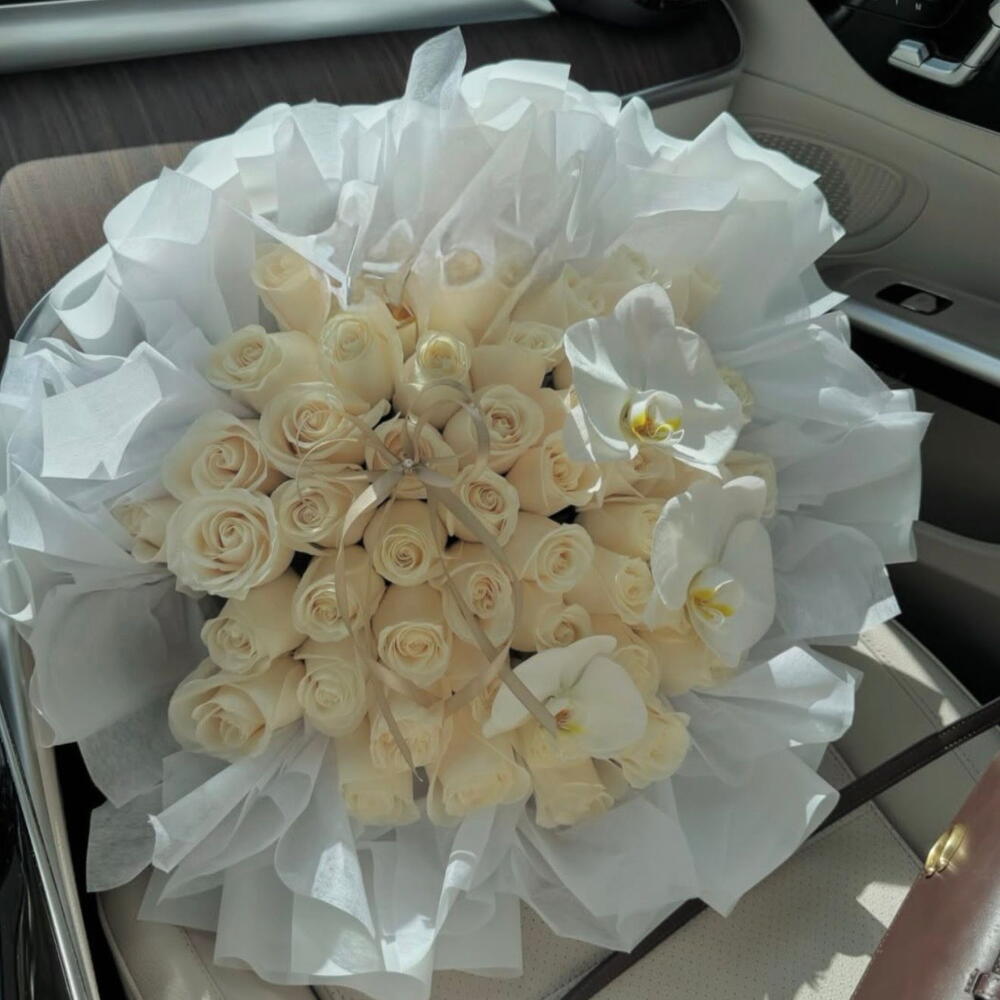 This elegant flower bouquet is filled with 35 enchanting white roses and 3 exotic cymbidium orchids. This bouquet will be a perfect and impressive gift to present to your loved ones on special occasions. Each flower is carefully selected, and the bouquet is long-lasting and fresh, adding a sophisticated touch to any setting.