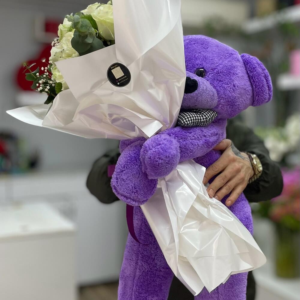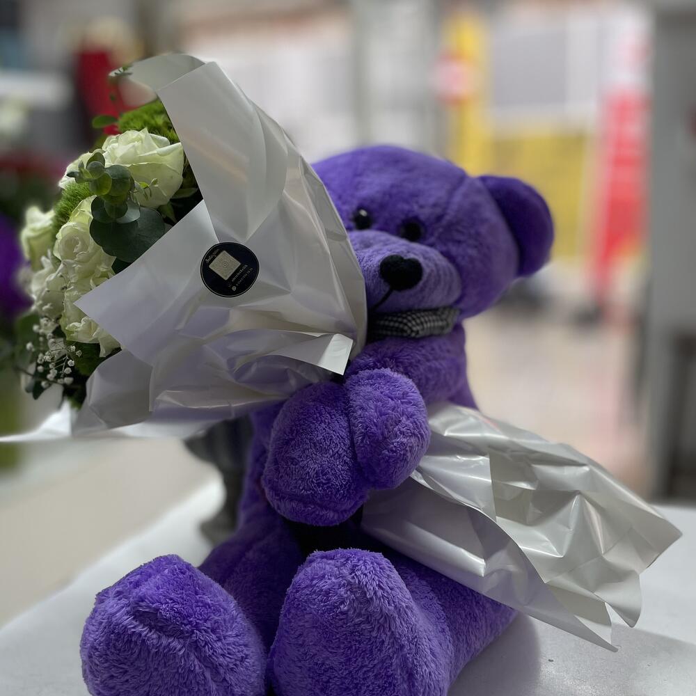 baby's breath flowers - 10 pcs eucalyptus - 15 pcs beyaz gül - 10 pcs 80 cm bear - 1 pcs