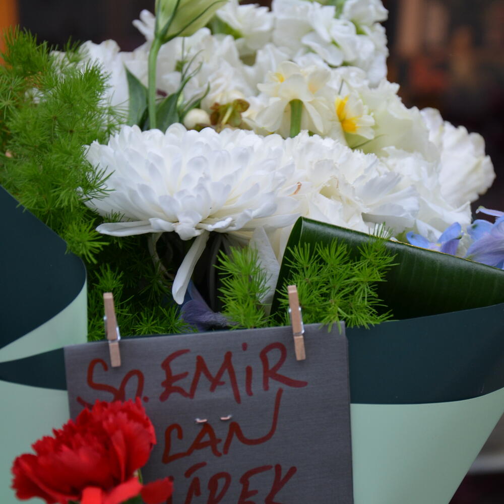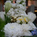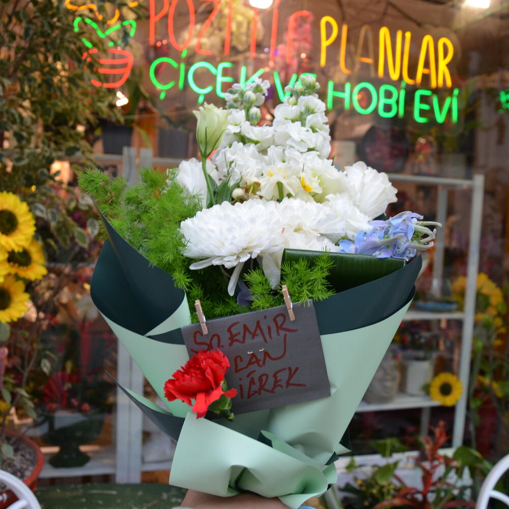 beyaz anastasia - 2 pcs lisyantus - 1 pcs white stock flower - 2 pcs daffodils - 3 pcs beyaz karanfil - 2 pcs