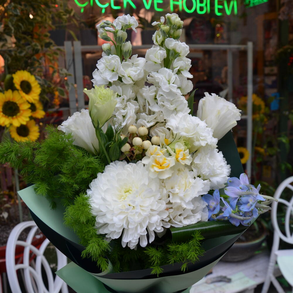 This elegant mixed bouquet is adorned with the delicate touch of white anastasias, the unique beauty of lisianthus, and the allure of white stock and daffodils. Additionally, two white carnations included in the bouquet complete it with an elegant touch. The individual beauty of each flower makes the entire bouquet shine brilliantly. This mixed bouquet is the perfect choice to make your loved ones feel how special they are.