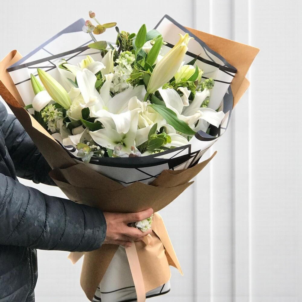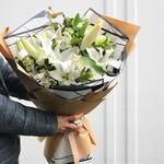 White Lily and Flowers Arrangement is a special bouquet designed with white lilies, symbols of elegance and purity. The bouquet is adorned with white lilies, white freesias, green leaves, and fresh flowers from nature. Elegantly wrapped in stylish kraft paper, this bouquet has a simple yet impressive design. The soothing and elegant shades of white make it a perfect emotional gift for your loved ones. Suitable for both special occasions and everyday surprises, this bouquet offers both a visually and emotionally unforgettable experience. Care Tips: To keep your bouquet fresh, it is recommended to store it in a cool environment away from direct sunlight. The water for the flowers should be changed daily, and the tips of the lily stems should be regularly cut. Especially since white lilies absorb water quickly, it is important to keep the water clean and fresh. To extend the life of your bouquet, it is advised to gently clean the leaves of the freesias and lilies, removing any wilted leaves from the flowers.