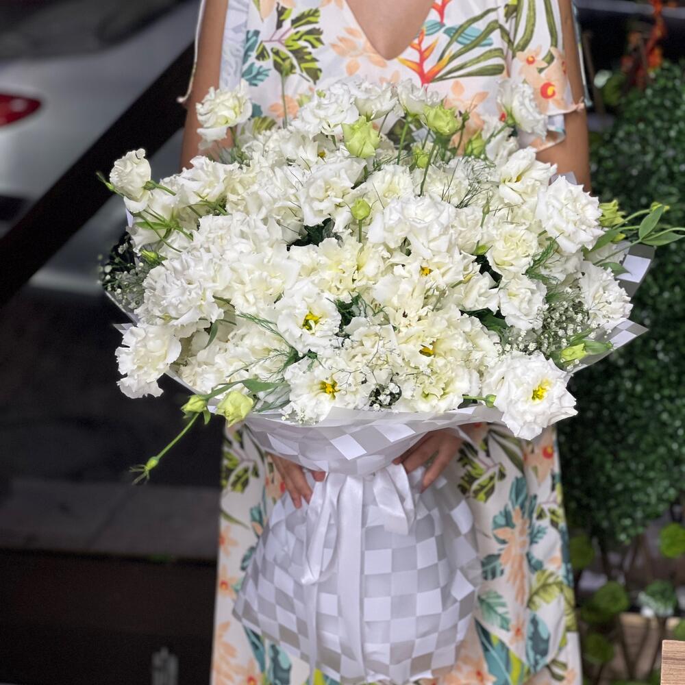 Bu özel çiçek buketi, romantizmi yansıtacak şekilde tasarlanmıştır. Bu duygusal ve zarif beyaz lisianthus buketi 81 adet çiçeğe sahiptir. Bu güzel çiçekler simetrik ve estetik bir şekilde düzenlenmişler, bu da buketin tüm yönlerden mükemmel görünmesini sağlar. Berrak beyaz lisyantuslar, saflığı ve masumiyeti temsil eder. İster bir düğün, ister bir doğum günü veya herhangi özel bir an için ideal bir hediye olabilecek bu zarif çiçek buketi, her ortamda güzellik ve zarafeti arttırır.