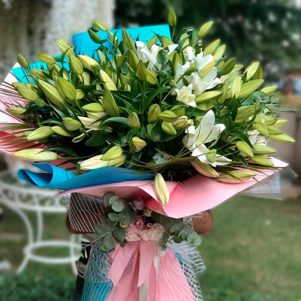 This striking bouquet made with one of nature's most elegant gifts, white lilies, creates an enchanting atmosphere with its refreshing energy. The buds that have not yet opened will bloom over time, helping to keep your bouquet beautiful for days. With turquoise and pink packaging details offering a modern look, this arrangement will make your special occasions unforgettable. To prolong your bouquet's life, trim a little off the ends of the stems each day and place them in fresh water. It is recommended to store it in a cool place out of direct sunlight. After the lilies open, you can carefully remove their pollen to help the flowers last longer.