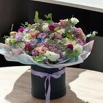 Gerbera - 3 pcs Lilium - 2 pcs Oasis - 2 pcs eucalyptus - 10 pcs yeşiller - 15 pcs pembe gül - 4 pcs siyah kutu - 1 pcs lisyantus - 25 pcs kasımpatı - 15 pcs ortanca (hydrangea macrophylla) - 1 pcs