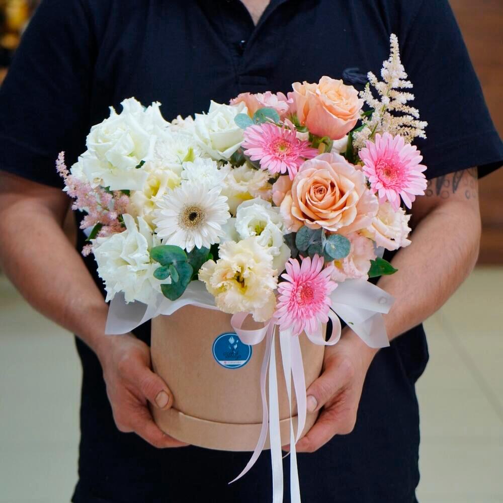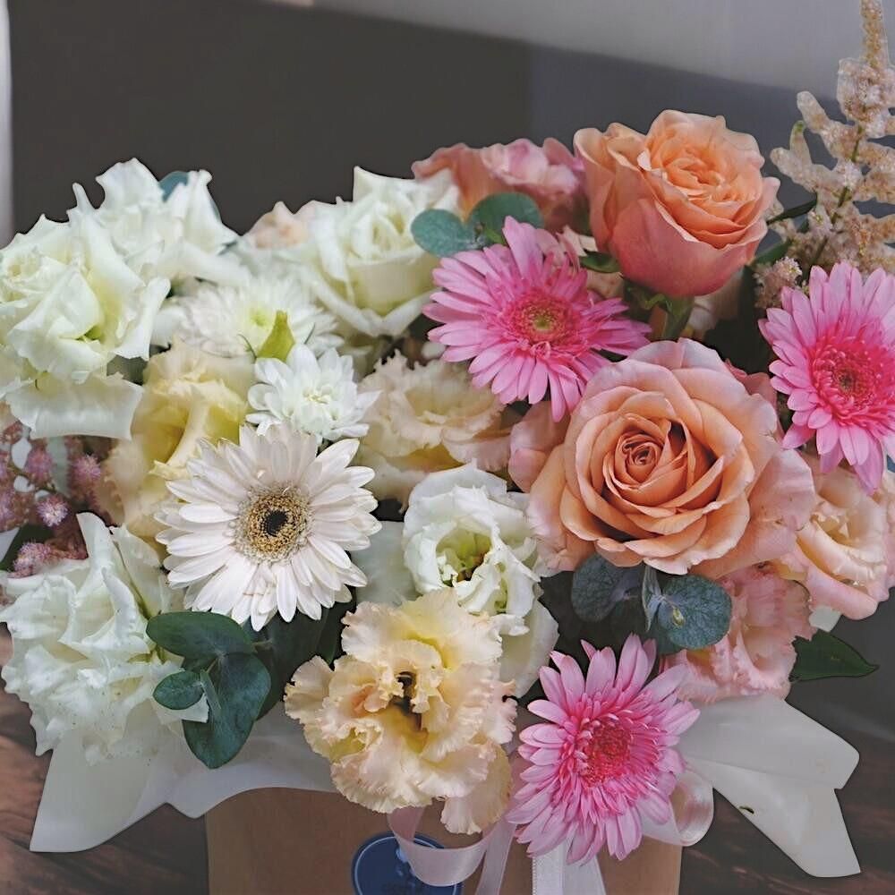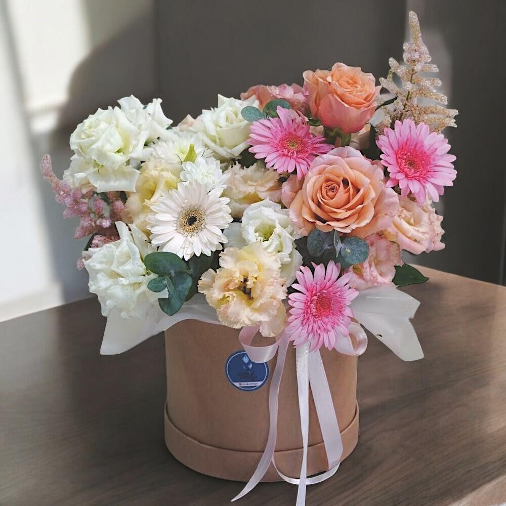 This charming box arrangement is a delicate fusion of soft blush tones and vibrant blooms, designed to uplift any space with elegance and freshness. Featuring premium roses, playful gerberas, and gentle eustomas, this floral design is both joyful and refined. Housed in a stylish hat box and adorned with a satin ribbon, it’s perfect as a gift for birthdays, thank-you gestures, or spontaneous surprises. To maintain its freshness, add a little clean water to the floral foam inside the box daily, and keep it away from direct sunlight or heat sources. With proper care, the flowers can last 5–7 days, offering lasting beauty and delight.