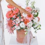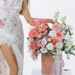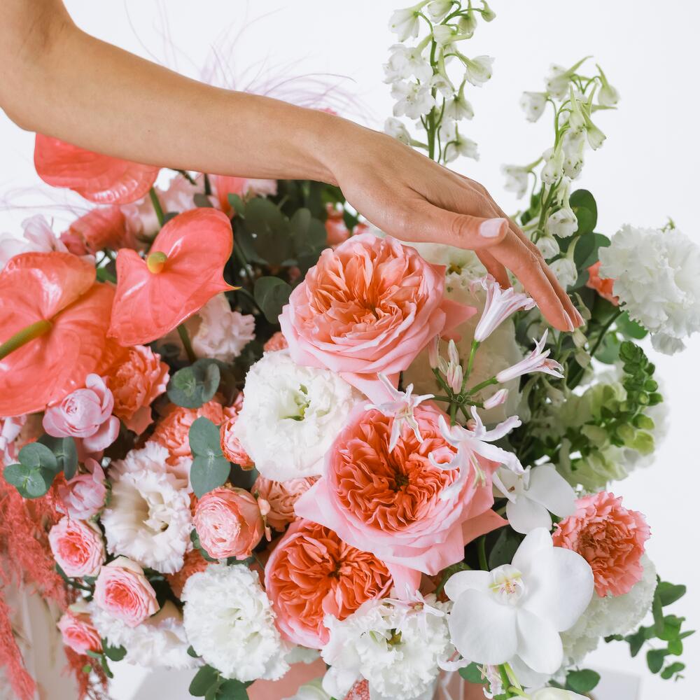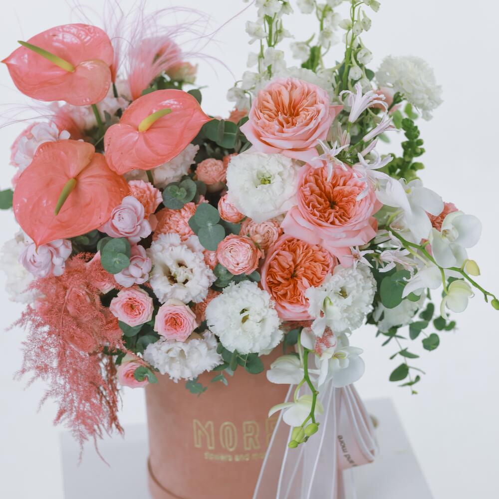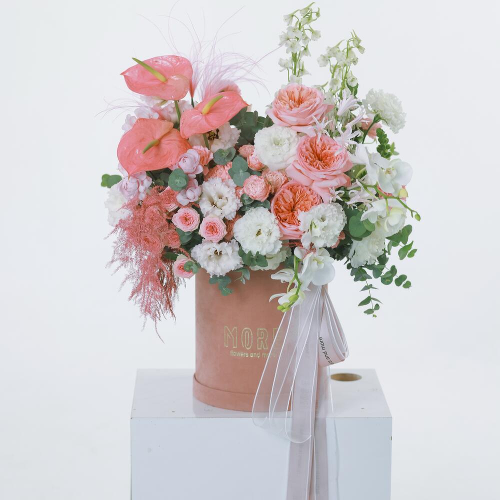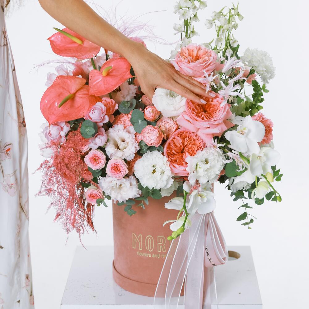 This stunning velvet box with white and pink flowers is a true masterpiece of floral art. The elegance of peony roses blends with the refinement of spray roses, creating a romantic and delicate composition. Orchids add a touch of mystery, while daffodils and anthuriums provide brightness and contrast, making the bouquet unforgettable. This gift is the epitome of luxury and sophistication, perfect for the most special occasions.