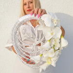 This elegant wedding kit is adorned with large white artificial flowers, especially selected ones. The flowers, most likely orchids, create a translucent beauty that reflects nature. The product includes 5 white pearl strands of varying lengths and thicknesses, making them suitable for any wedding theme. It also contains 2 small white flower accents and 3 large semicircular rings. These elements add a stylish touch to a table, a chair, or any space. This chic product will make your wedding atmosphere romantic and elegant, leaving an unforgettable impression.