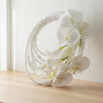 large white artificial flowers (probably orchids) - 5 pcs white pearl strands (different lengths and thicknesses) - 3 pcs large semicircular wreath - 2 pcs tiny white flower additions - 3 pcs