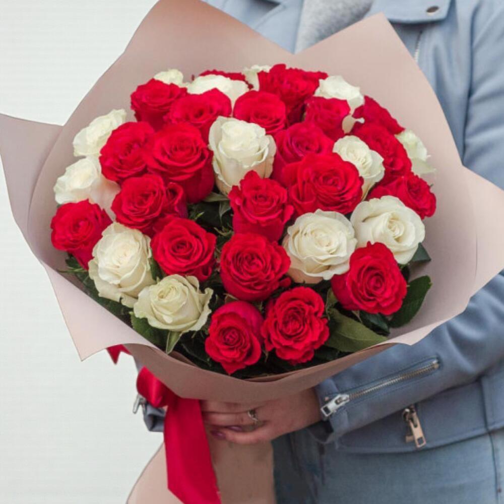 The splendor created by the combination of imported white and red roses will brighten our recipient's day.