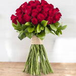 This striking red rose bouquet is the perfect way to beautifully express your feelings to your loved ones. Twenty-five fresh red roses, complemented by elegant green leaves and natural touches, create a stunning arrangement. The elegance of the roses, combined with the design, offers a perfect gift for any special occasion. A great choice for anniversaries, Valentine's Day, or to make a romantic surprise. Tied with natural jute twine, this bouquet offers a simple yet stylish look. Both eye-catching and meaningful, this design will reflect your love in the most special way.