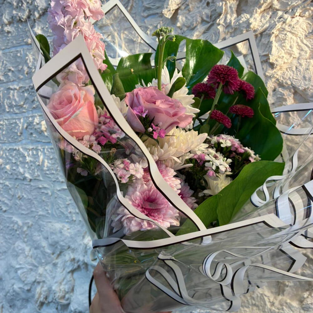 This carefully prepared mixed bouquet includes 5 white chrysanthemums, 1 stem of greenery, 3 pink chrysanthemums and 2 pink stocks. Rich and colorful, this floral composition is perfect for making your loved ones smile and instantly adding warmth and cheer to any setting. Whether as a birthday gift or simply because—this bouquet is always the perfect choice. Stylish and modern, elegant and sure to bring a smile to your face, this eye-catching bouquet guarantees happiness.
