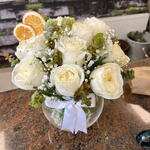 In the vase, 9 white roses.