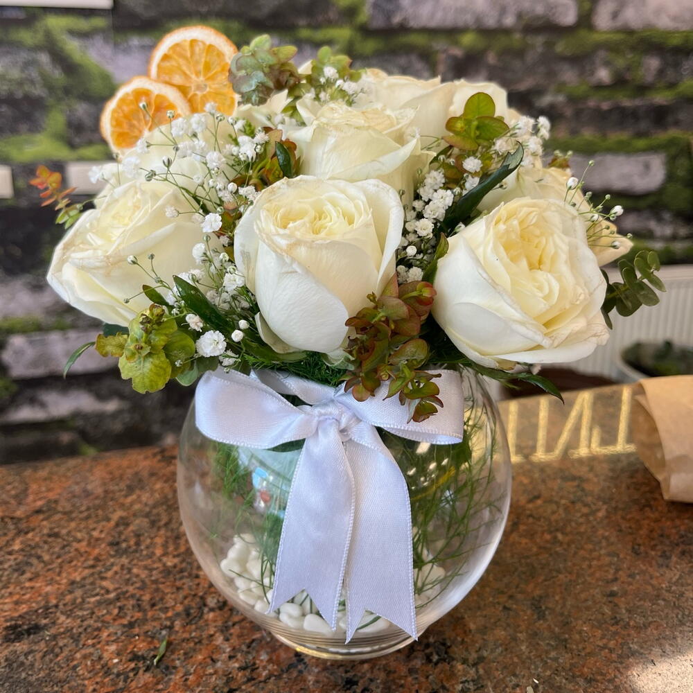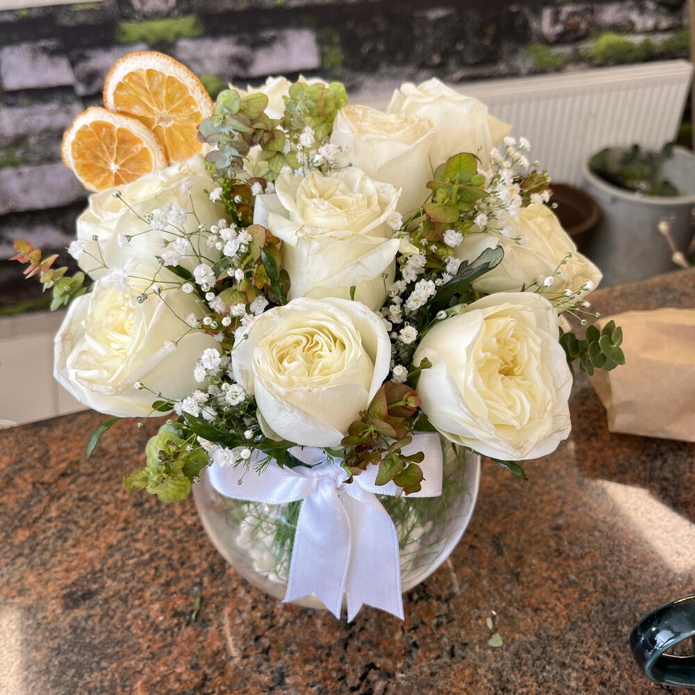beyaz gül - 9 pcs okaliptus - 10 pcs orange - 2 pcs