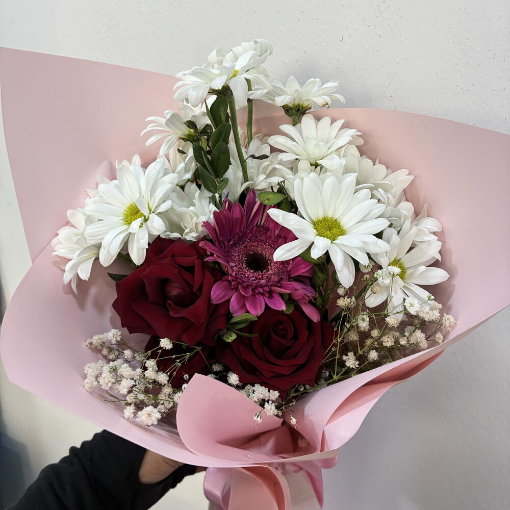 This special bouquet, crafted with the elegance of white daisies, the noble presence of red roses, and a vibrant gerbera in the center, reflects your love, style, and sincerity all at once. Its pink packaging and natural filler flowers offer a romantic yet modern look. It's the perfect choice for birthdays, anniversaries, thank yous, or simply to say "I felt like giving it." 🌷