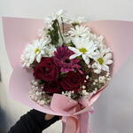 gerbera mini - 1 pcs gypsophila - 2 pcs daisy white - 3 pcs rose red - 3 pcs