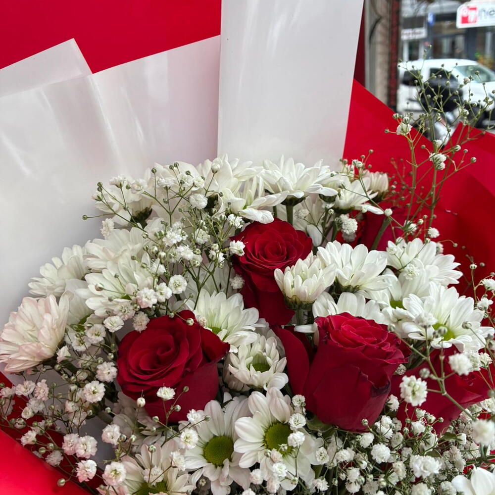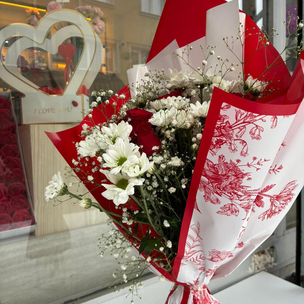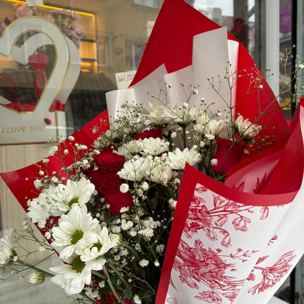 papatya - 5 pcs kirmizi gül - 2 pcs gypsophila - 2 pcs
