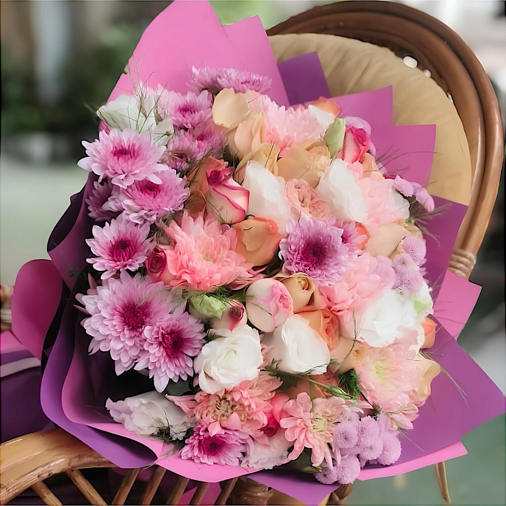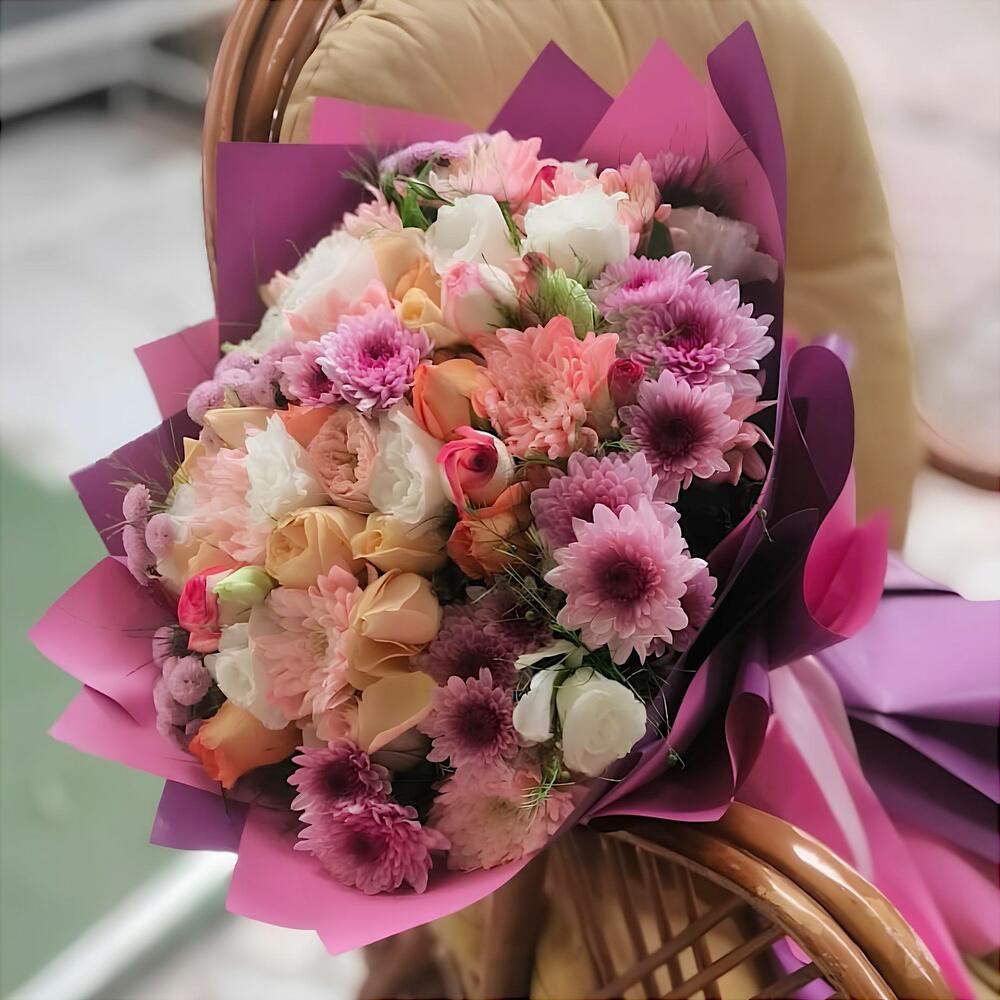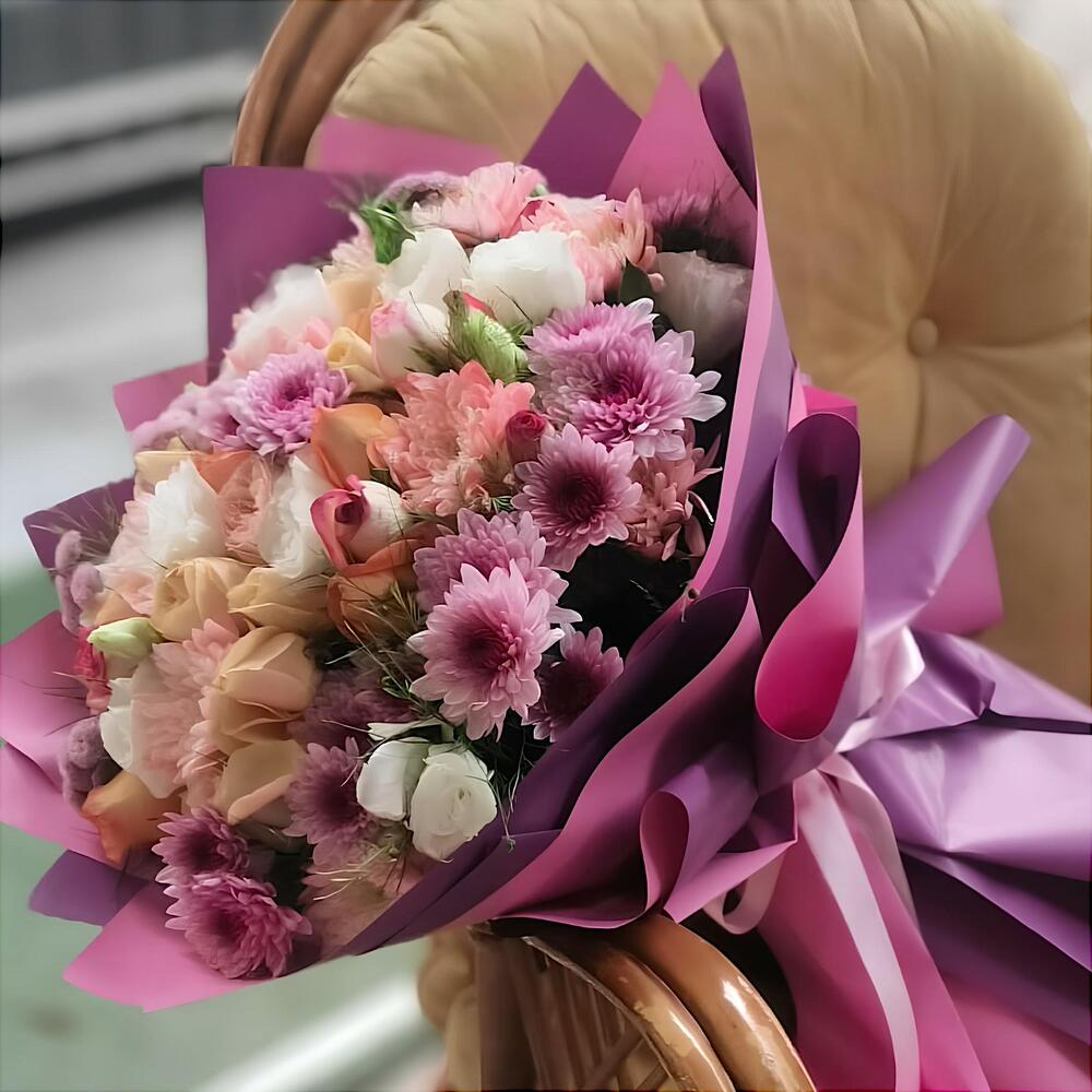 The Sunset Bouquet, which brings together the warmest hues, creates a romantic and enchanting atmosphere. Completed with pastel-toned roses and soft pink and purple chrysanthemums, this bouquet is one of the most special ways to delight your loved ones with elegant touches.