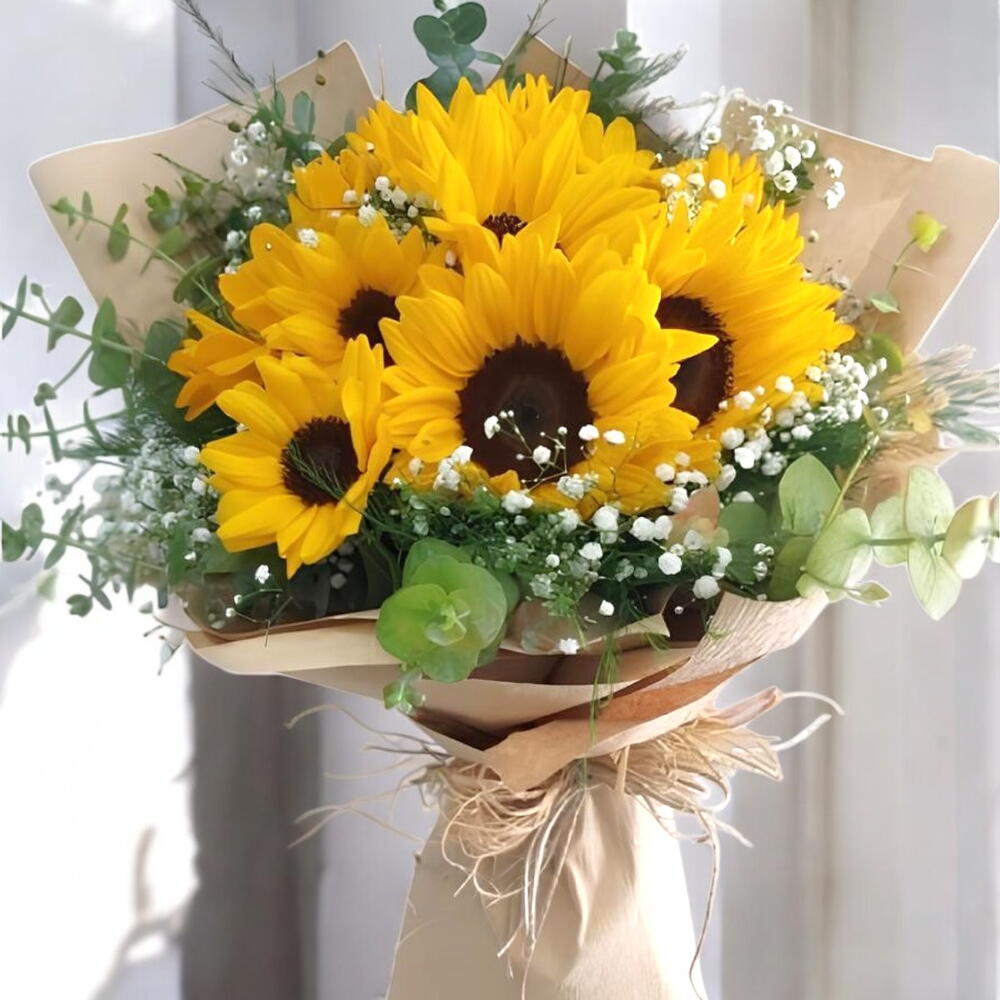 This vibrant sunflower bouquet will fill every moment with joy! Sunflowers in yellow and orange tones symbolize the warmth of the sun and happiness. Completed with white baby's breath and green leaves, this arrangement offers a natural, fresh look. Wrapped in kraft paper and tied with natural twine, this bouquet carries a rustic chic. A perfect gift to send to your loved ones, this bouquet is a great choice for birthdays, celebrations, or just to say thank you. Bringing liveliness to any setting, this bouquet will leave an unforgettable impression. The bright, cheerful appearance of the sunflowers will make your loved ones smile!