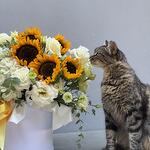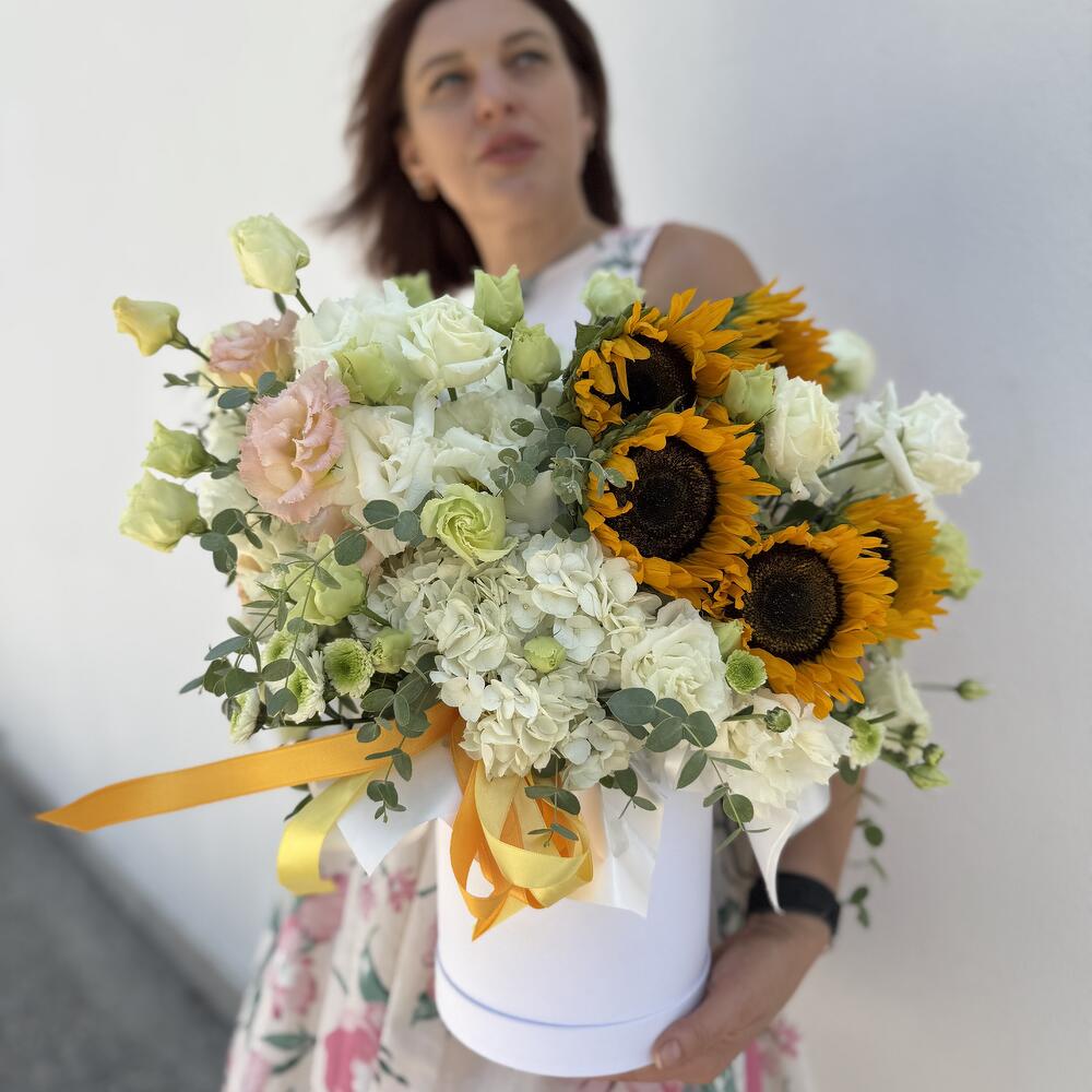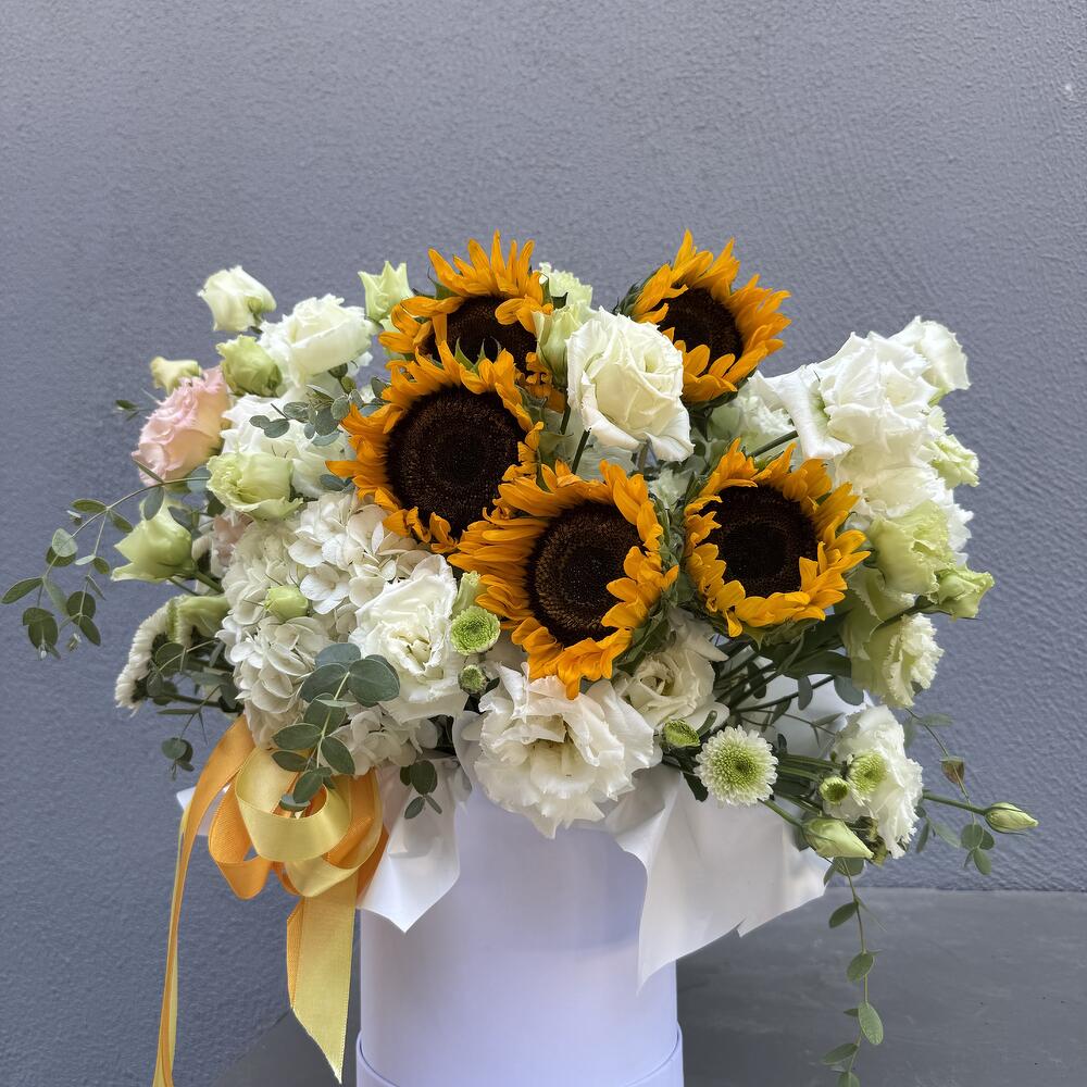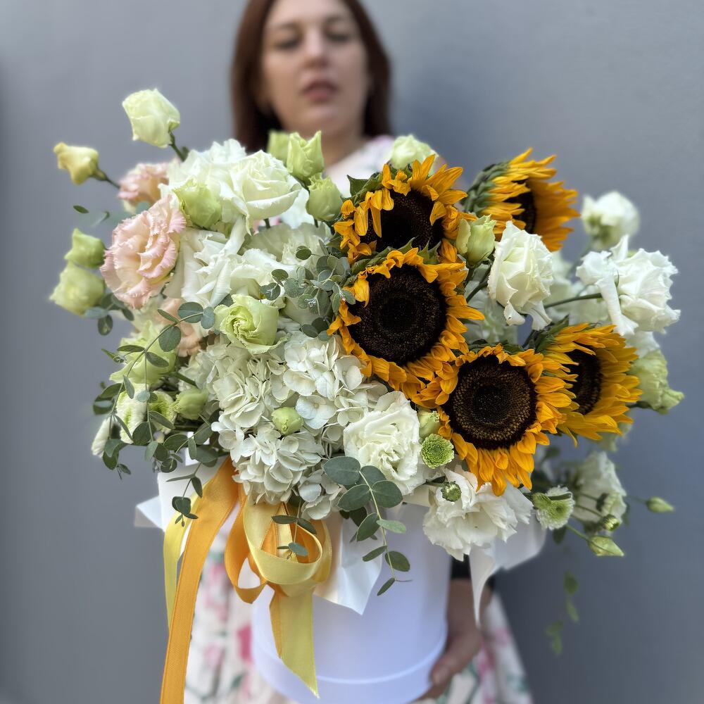 ayçiçeği - 5 pcs lizijantus - 4 pcs ortanca - 1 pcs eucalyptus - 2 pcs