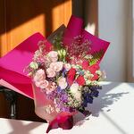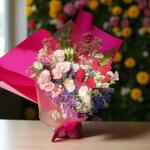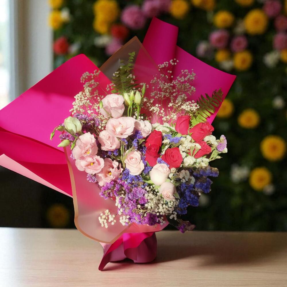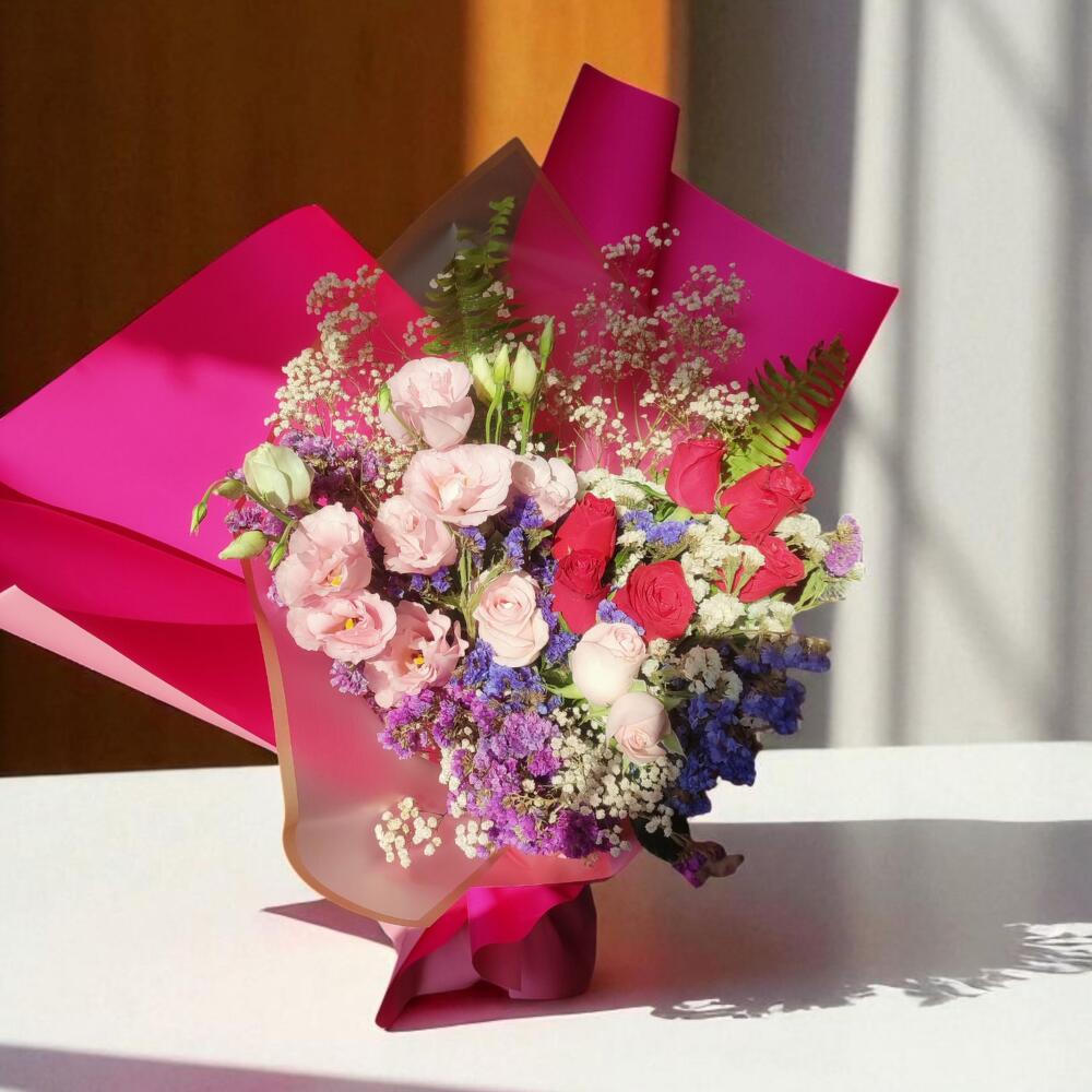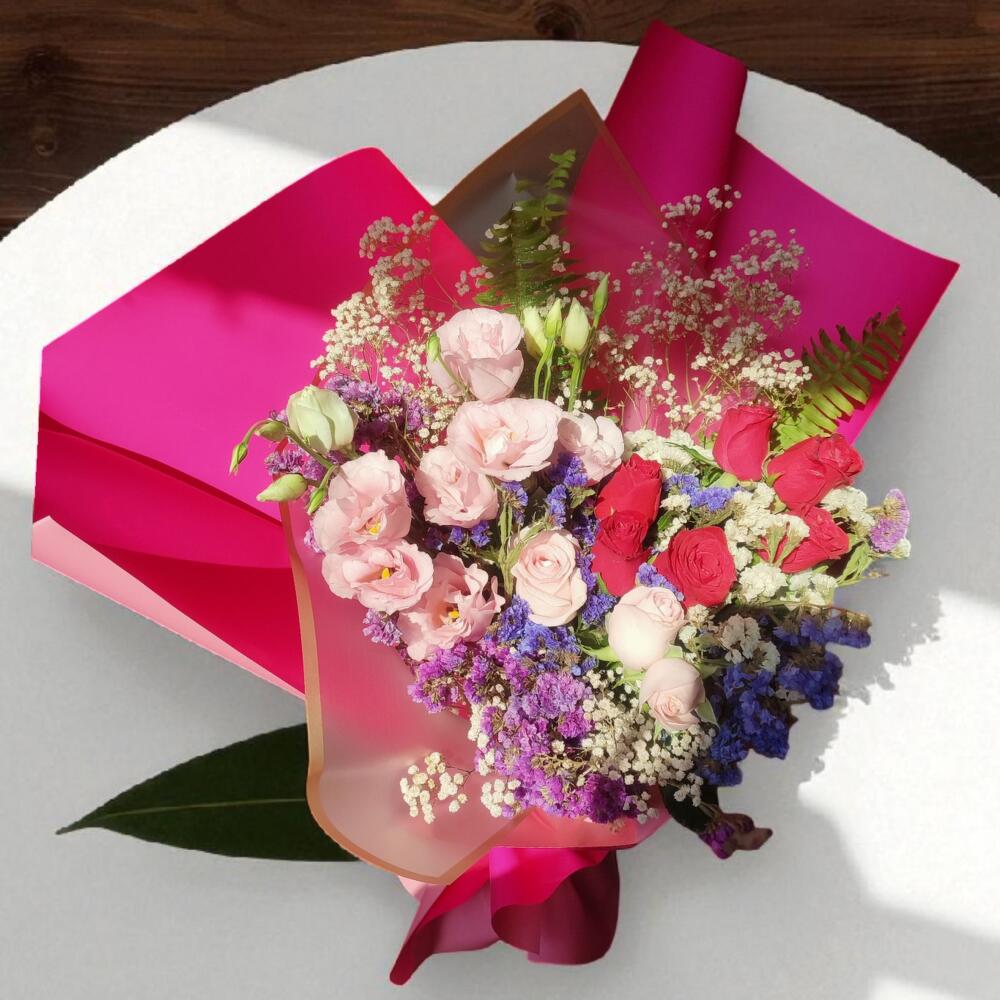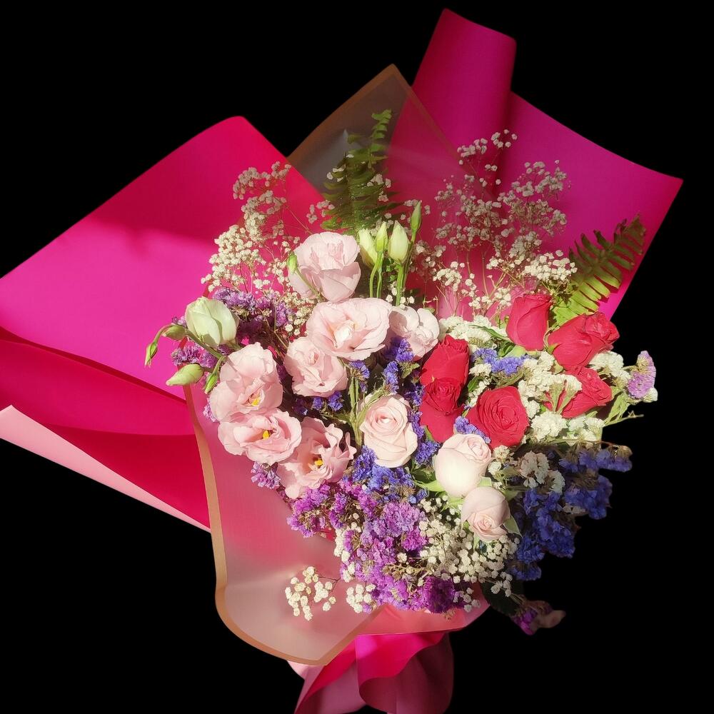 lisianthus pink - 11 pcs statis - 21 pcs gypsophila - 21 pcs red rose red rose - 7 pcs yeşil yaprak dekor - 3 pcs
