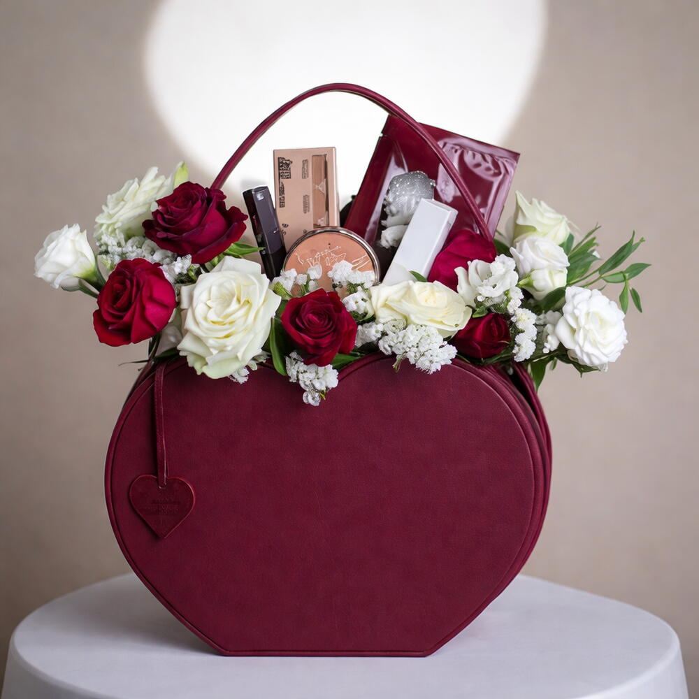 Makeup and Fresh Flower Set with Heart-Shaped Faux Leather Bag
