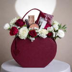 Elegance and care in one! This special set, presented in a burgundy faux leather heart-shaped bag, brings together the energy of the freshest flowers and a professional makeup set. The natural scent and vibrancy of the fresh flowers instantly lift the mood and refresh the space. Notable for its stylish design, this set is ideal for gifting your loved ones a fresh smile and leaving them with a lasting accessory that will make them feel special. This arrangement, combining nature's freshness with modern care, is the most stylish and functional way to convey your best wishes. ❤️💄🌸