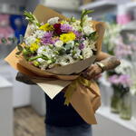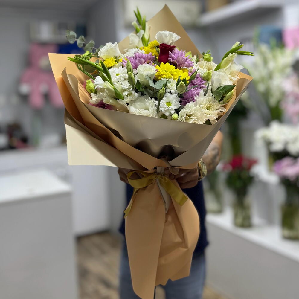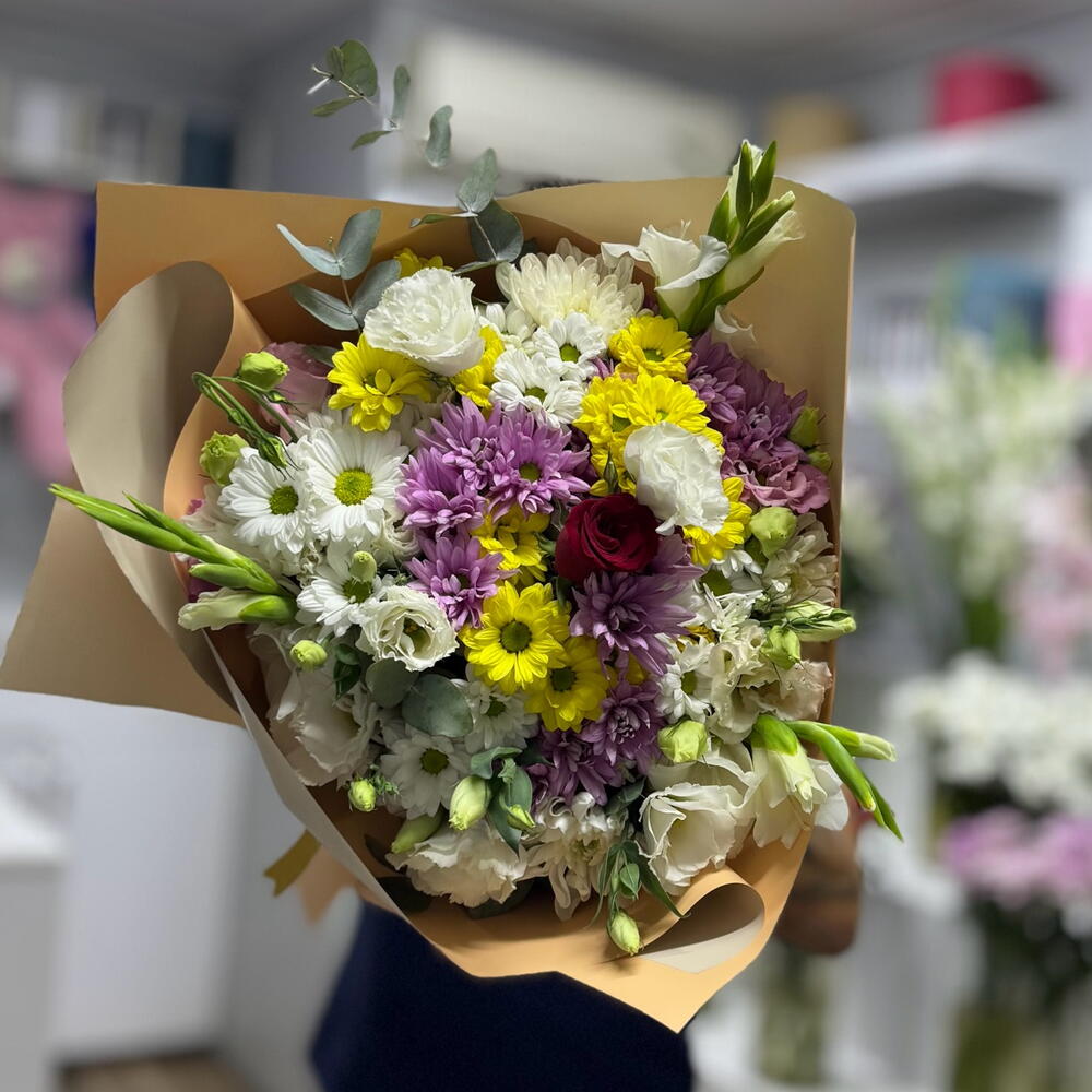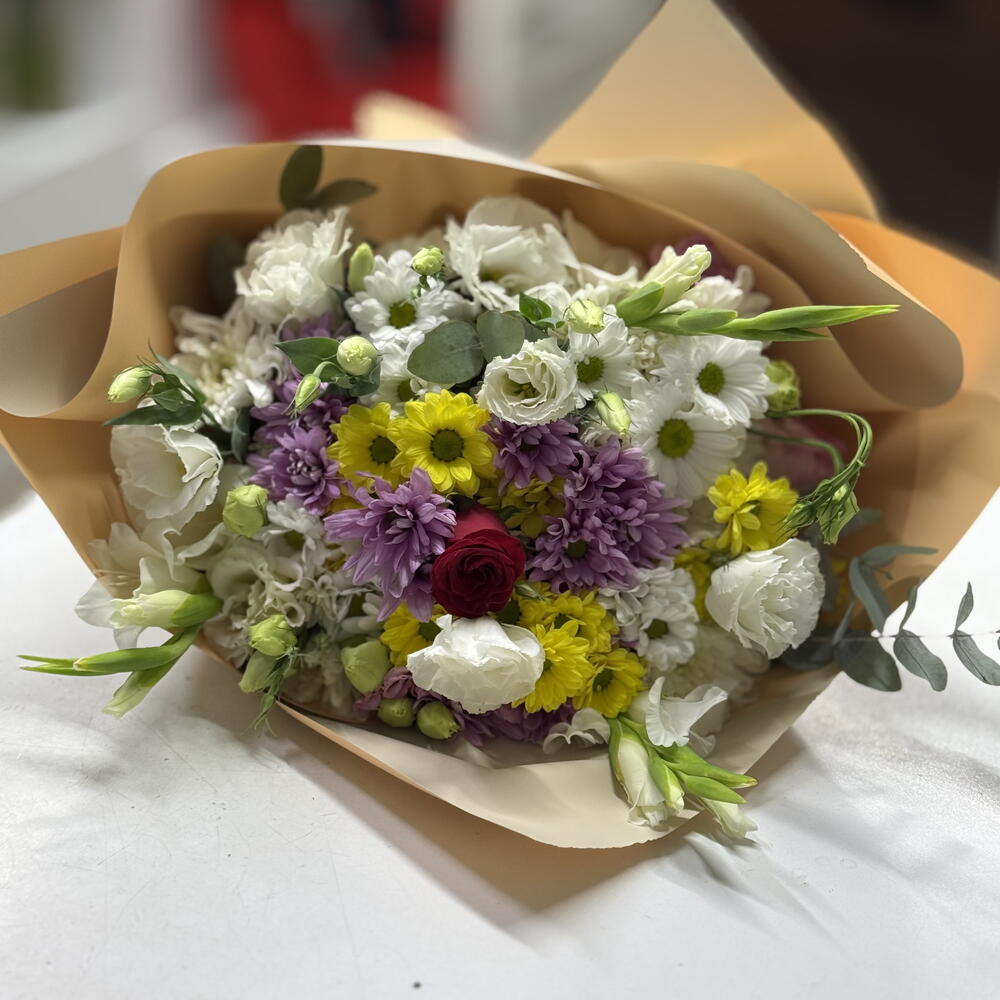 Bouquet of mixed seasonal flowers with 1 rose in the center