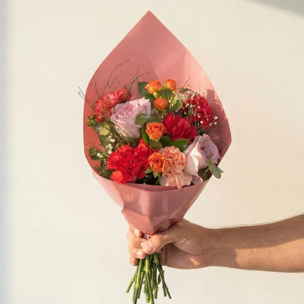 This special bouquet, prepared with the elegant touch of Yıldız Flower House, brings together the eye-catching harmony of red carnations, lilac roses and orange climbing roses. Symbolizing energy and romance with its vibrant colors, this arrangement will be one of the most meaningful gifts you can give to your loved ones. With its dazzling tones, this bouquet is perfect for crowning any of your special occasions. Care Instructions: Keep your flowers in a cool place away from direct sunlight. After placing them in a vase, refresh the water every 2 days. Re-cut the stem ends diagonally to help the flowers absorb water better.