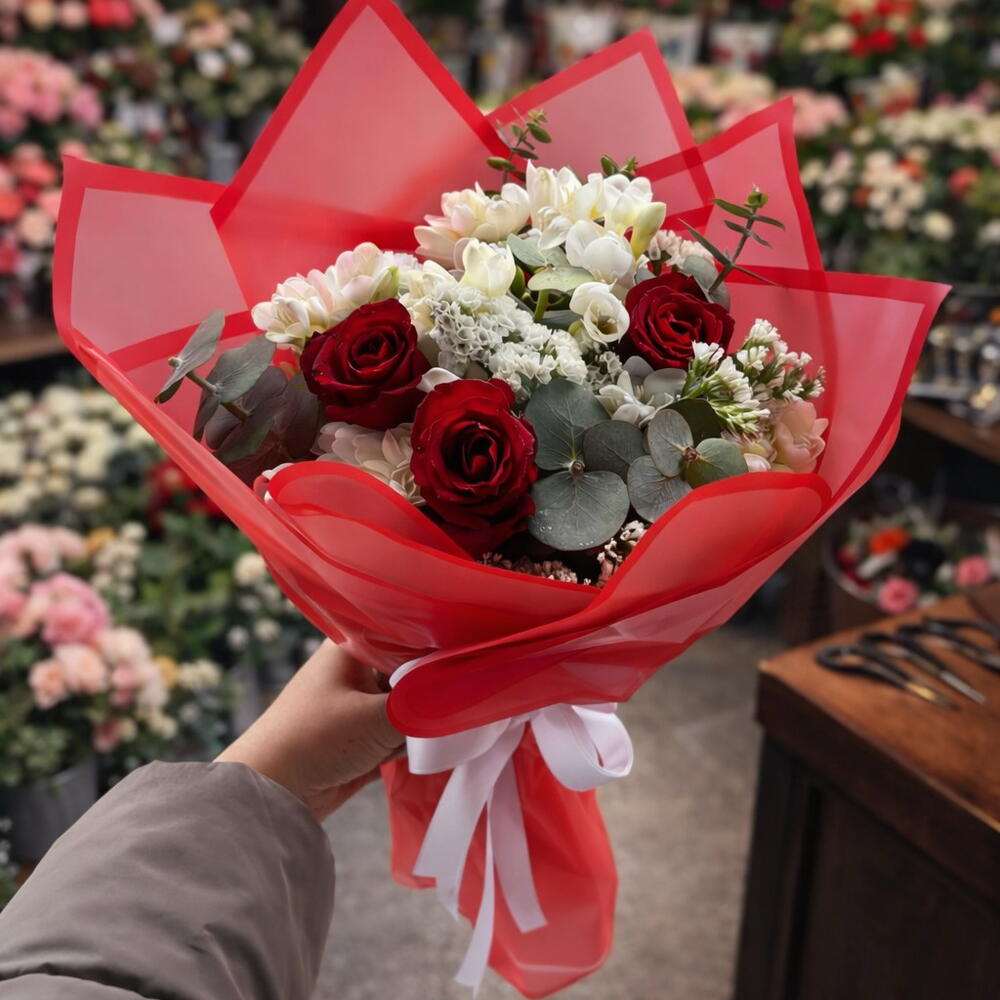 💐 Tutkunun simgesi kırmızı güller ile zarafetin temsilcisi beyaz frezyaların muhteşem uyumuyla hazırlanan bu özel buket; romantik duygularınızı en etkileyici şekilde ifade etmenizi sağlar. Canlı renk kontrastı ve modern kırmızı ambalaj tasarımıyla dikkat çeken bu aranjman, özel anlar için kusursuz bir seçimdir. ✨ Taze ve kaliteli çiçeklerden özenle hazırlanan buket; sevgiliye sürpriz, yıldönümü, doğum günü ve Sevgililer Günü gibi özel günlerde unutulmaz bir hediye alternatifi sunar. 📍 Buca çiçekçi, Bornova çiçekçi, Gaziemir çiçekçi ve Konak çiçekçi aramalarında öne çıkan bu romantik buket ile sevdiklerinizi mutlu edin. 🚚 İzmir içi aynı gün hızlı teslimat imkanı. 💖 Şıklığı, romantizmi ve duyguyu bir arada sunan premium çiçek tasarımı!