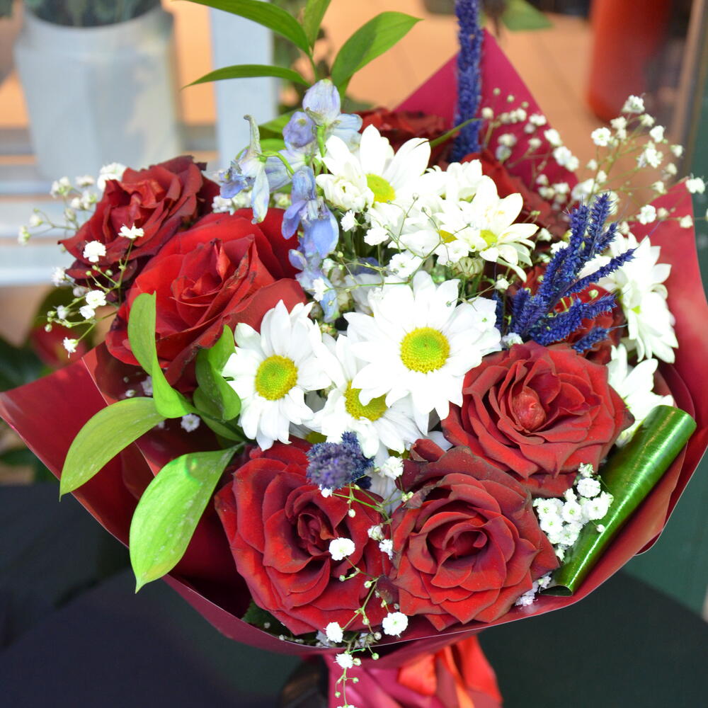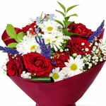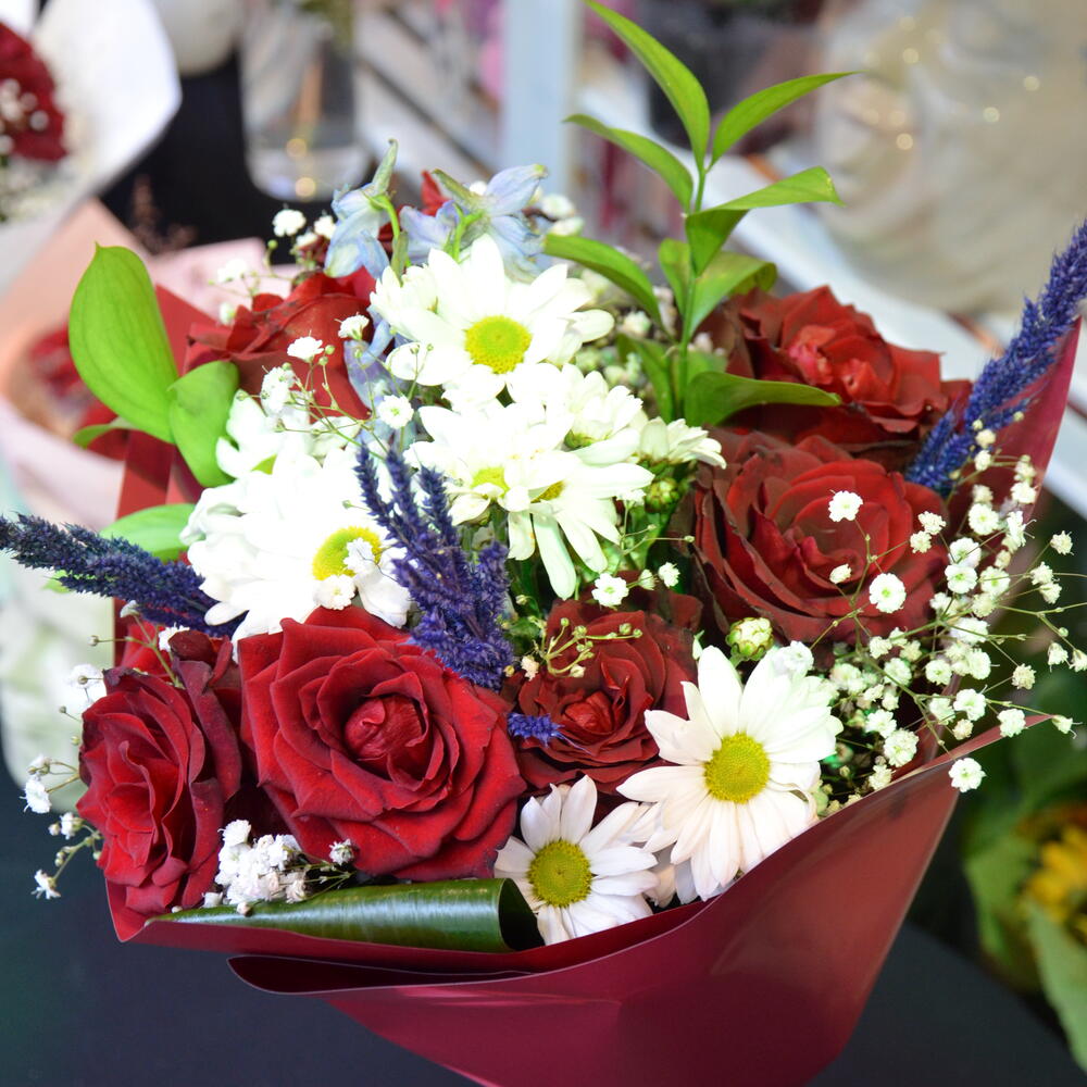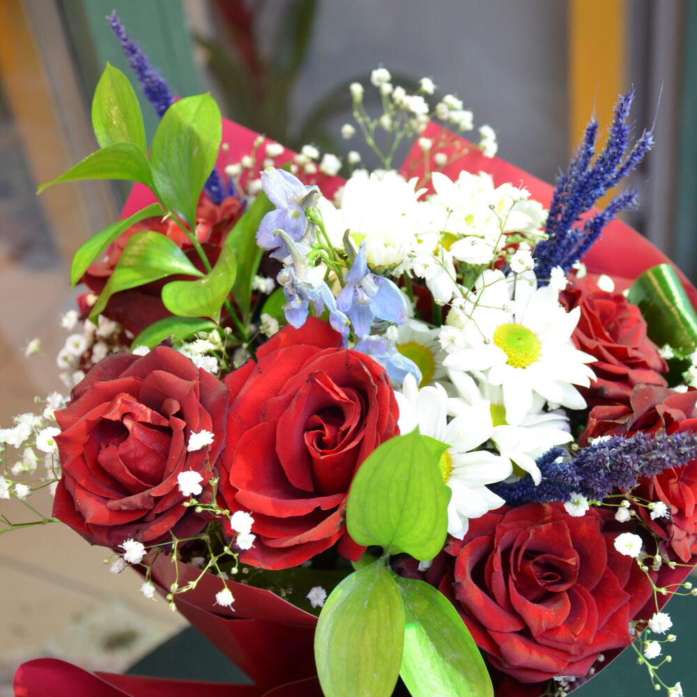 This elegant flower bouquet is carefully arranged with nine red roses, three daisies, three green filler stems, and four lavender stems. The enchanting combination of these flowers will add a sophisticated touch to any room. Representing both simplicity and elegance, this bouquet expresses your feelings for your loved ones in the most beautiful way.