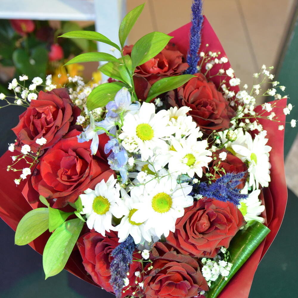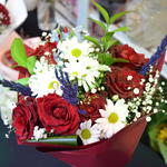 kırmızı gül - 9 pcs lavanta - 4 pcs green filler - 3 pcs with daisies - 3 pcs