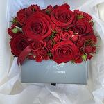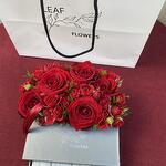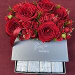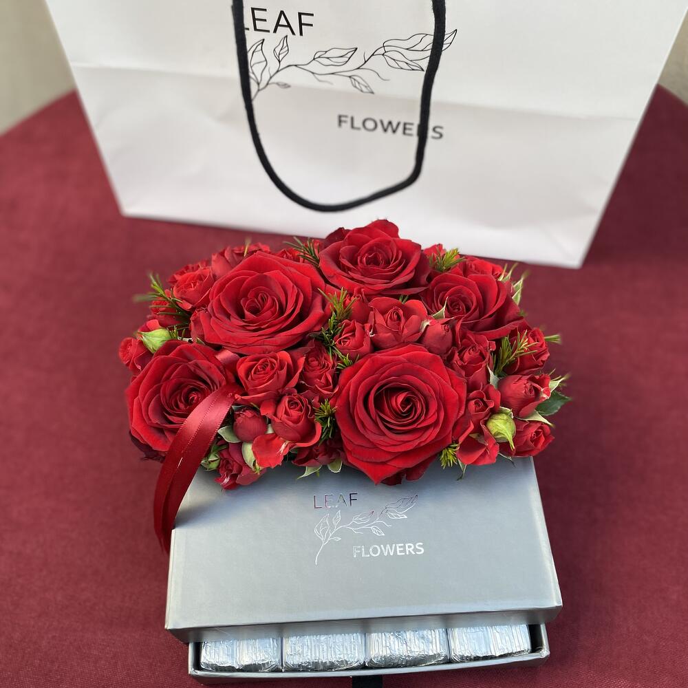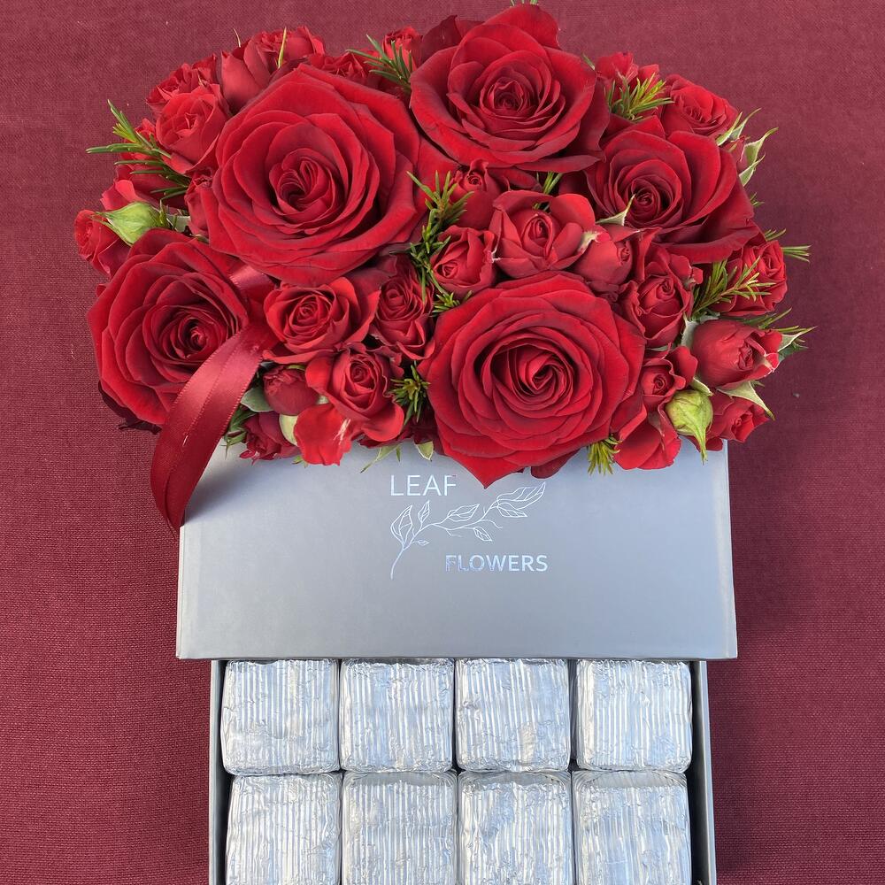 kutu - 1 pcs kırmızı gül - 5 pcs yeşillik - 5 pcs red arbor rose - 10 pcs special pistachio square chocolate - 16 pcs white bag tote - 1 pcs