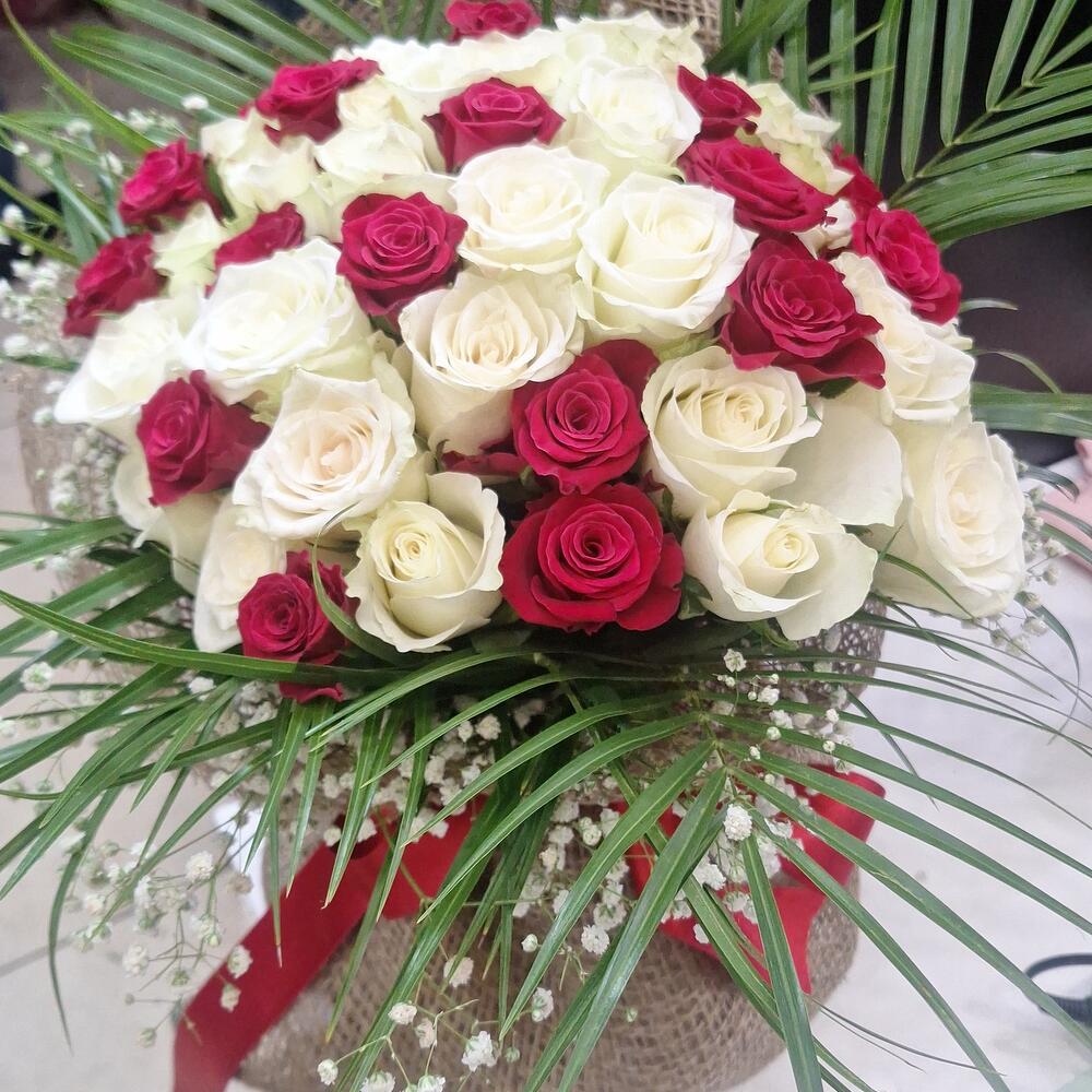 Bu büyüleyici mono buket, aşk ve masumiyetin mükemmel uyumunu temsil ediyor. İçerisinde 20 adet saf beyaz gül, masumiyeti ve doğruluğu simgelerken, 30 adet tutkulu kırmızı gül ise derin sevgi ve arzuyu ifade eder. İster bir düğün, ister bir doğum günü, ister sevdiğiniz birine romantik bir sürpriz olsun - bu güzel buket her zaman mükemmel bir seçim olacaktır. Tamamen doğal, taze ve kokulu çiçeklerden oluşan bu buket, alıcısına unutulmaz bir izlenim bırakacak.