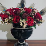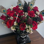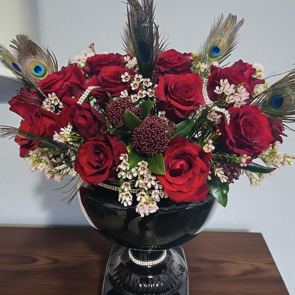 This showy arrangement is the perfect combination of passion and elegance. Deep red roses reflect romance in the most beautiful way, while exotic peacock feathers and decorative wax flowers add a mesmerizing touch to the design. A vase with black stones gives a luxurious, modern feel, making the arrangement even more striking. It is a unique choice for special occasions, events, or decorative purposes. Store the arrangement in a cool place away from direct sunlight. To keep the roses fresh for longer, change the vase water every 2 days and lightly trim the stem ends. Maintaining ambient humidity can enhance the flowers' vitality.