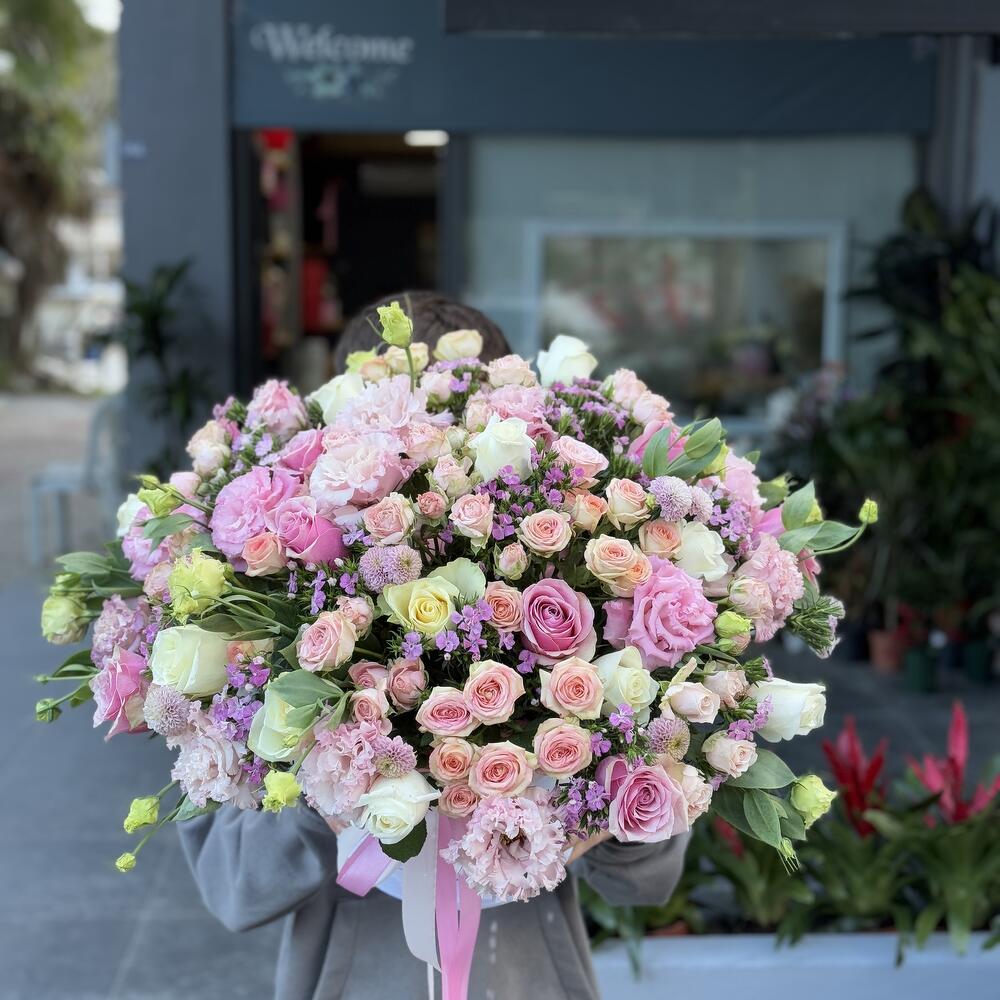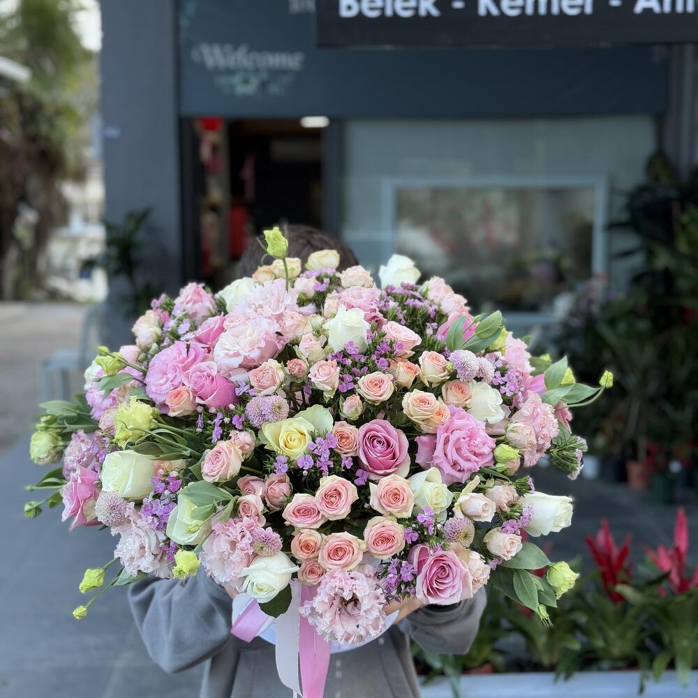 Eustoma white - 20 pcs eustoma pink - 20 pcs pink roses - 25 pcs white roses - 25 pcs kustavoy roza - 21 pcs loving look in the box - 101 pcs