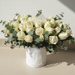 This flower arrangement, presented in an impressive box, consists of 35 white roses, 15 ruscus, and 19 eucalyptus leaves. The elegant beauty of the white roses meets the breathtaking freshness of the ruscus and eucalyptus leaves. This striking and eye-catching flower arrangement will leave your loved ones in awe.