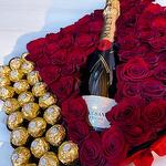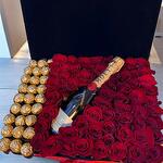 Boxed red roses with champagne and chocolates, the number of roses varies from 71 to 81 depending on the size of the days' heads.