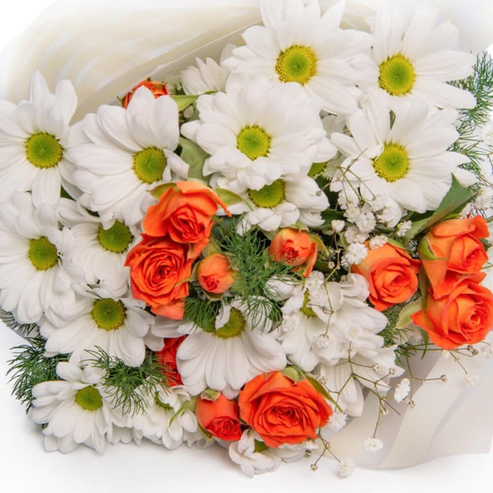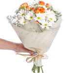 This enchanting floral bouquet is adorned with 2 elegant gypsophilas, 40 white daisies and 12 orange garden roses. Its flawless, perfect appearance is completed with raffia and attractive leopard-print bouquet paper. This bouquet is an ideal choice to express your love and feelings. This design, which will make you feel special, will also add a sophisticated touch to any home.