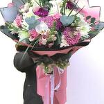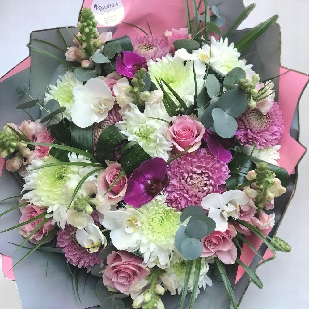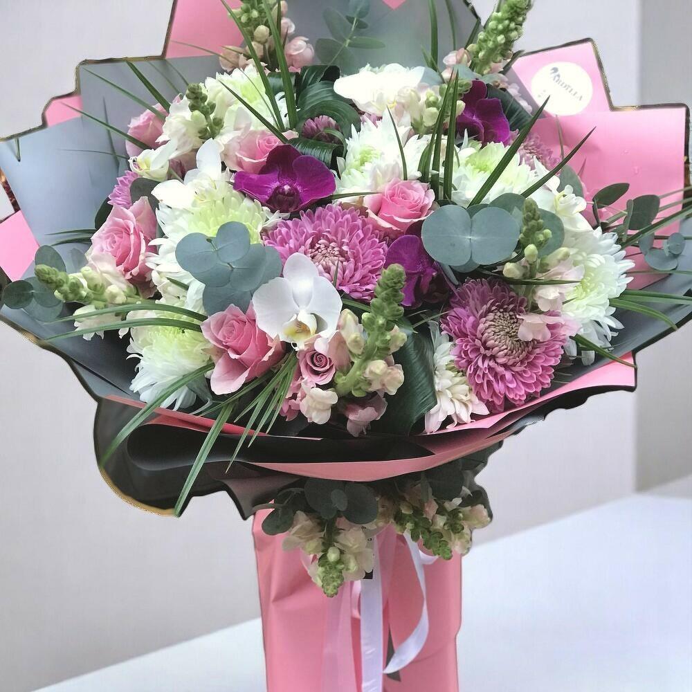 This special bouquet, where romantic tones and elegant flowers meet, enchants with every detail. White orchids and purple orchids come together in perfect harmony with pastel pink roses and large chrysanthemums. Eucalyptus leaves and green sprigs scattered throughout the bouquet add a natural and sophisticated touch. A perfect choice for a birthday, anniversary, or a special thank-you gift. Keep the bouquet cool and in the shade to extend the life of the flowers. If you have a vase, add a small amount of water to it and refresh the flowers daily. With its fresh fragrance and elegant design, this bouquet will be everyone's favorite!