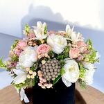 In this eye-catching box, the floral arrangement draws attention with its soft tones and elegant composition. It contains 10 white peonies, 15 imported roses in pastel tones and 10 elegant imported tulips; enriched with two different garnishes and placed in a special black velvet box. This design, a combination of classic flowers with modern touches, is both a romantic gift and an aesthetic decorative object. It is a perfect choice for birthdays, anniversaries, new job celebrations, or to say "I love you." This luxurious, love-filled flower box helps you convey your feelings in the most elegant way.