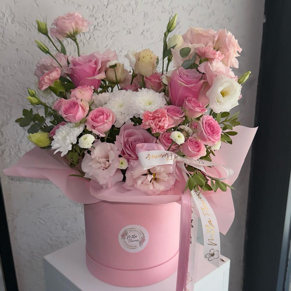 Spray rose - 3 pcs Lisianthus - 11 pcs eucalyptus - 5 pcs karanfil - 5 pcs kutu - 1 pcs krizantem - 1 pcs pembe gül - 3 pcs