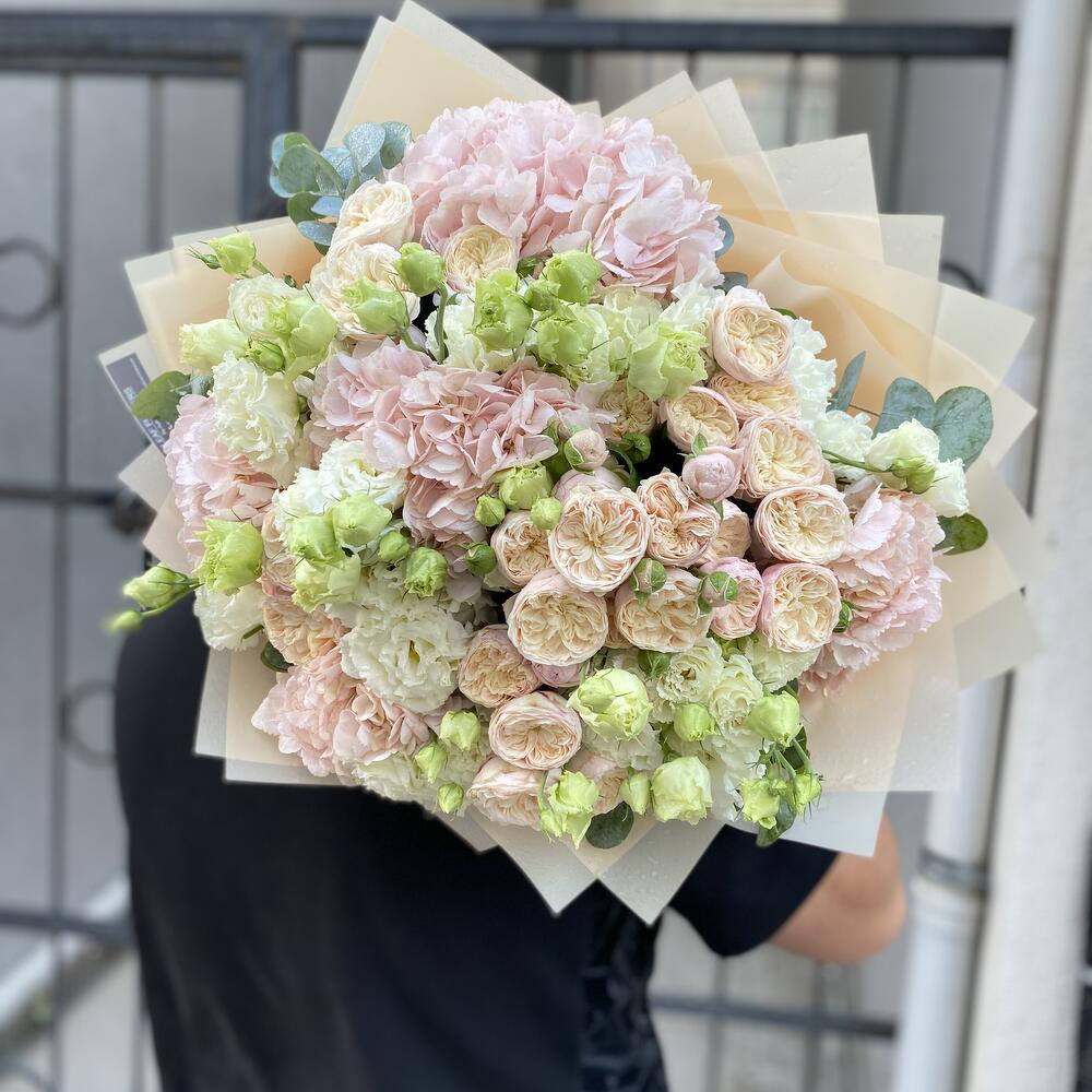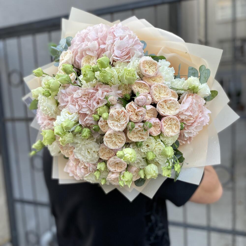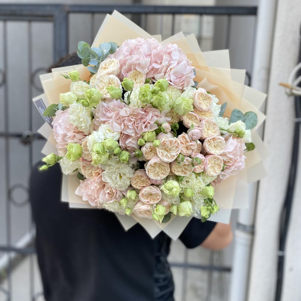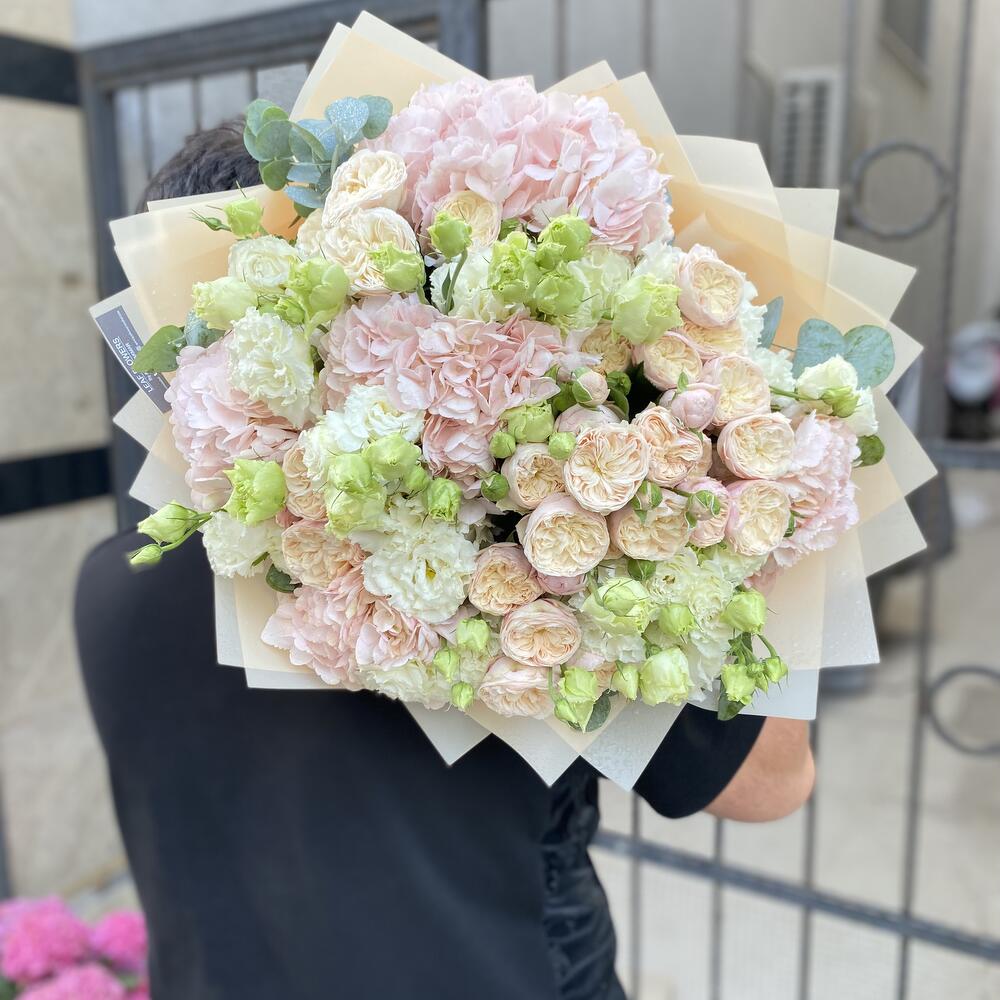 eucalyptus - 10 pcs beyaz lisyantus - 10 pcs pale pink hydrangea - 5 pcs special arbor rose cream - 5 pcs